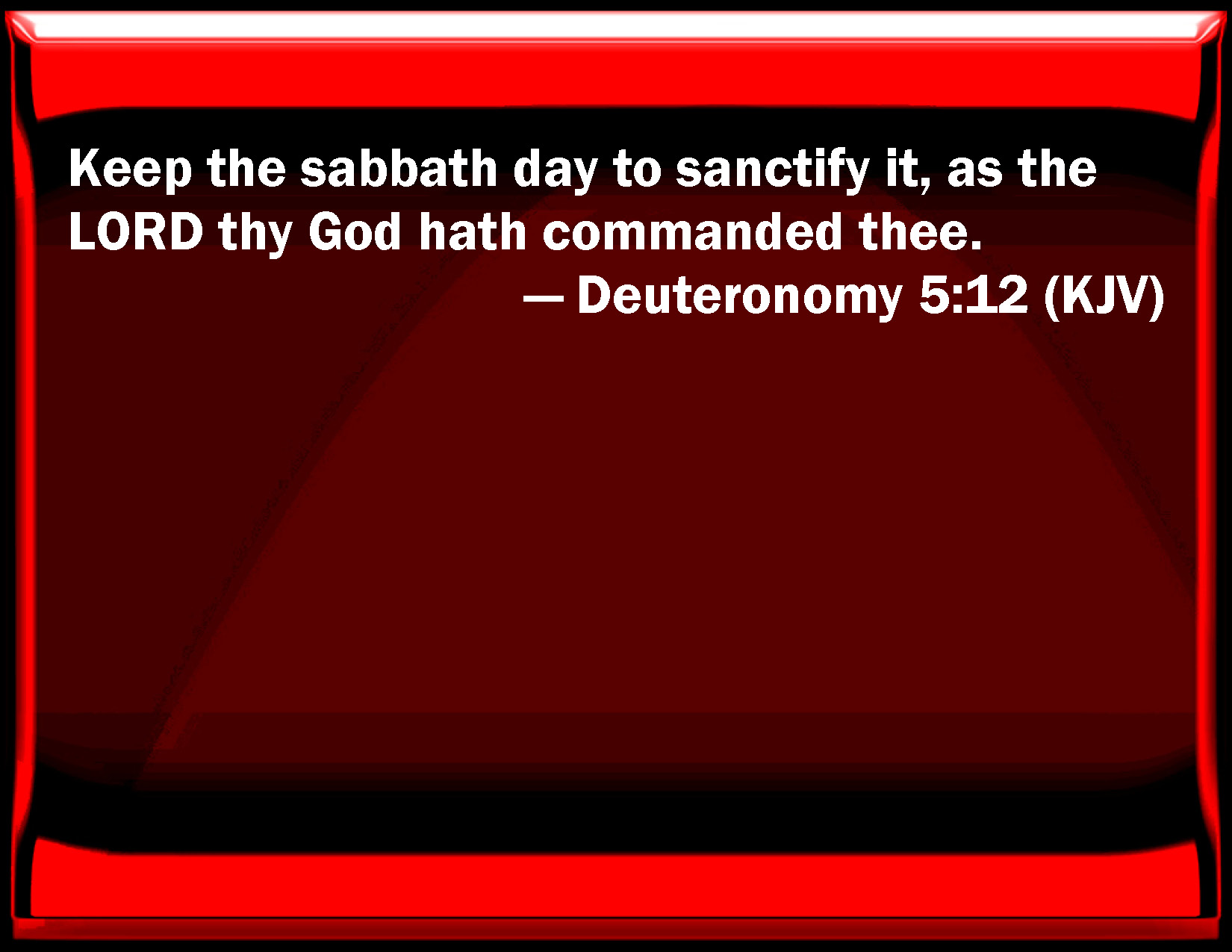 Bible Verse Slide Deuteronomy 5:12 Keep the sabbath day to sanctify it, as the LORD your God has commanded you. KJV: Keep the sabbath day to sanctify it, as the LORD thy God hath commanded thee. DRB: Observe the day of the sabbath, to sanctify it, as the Lord thy God hath commanded thee. DBT: Keep the sabbath day to hallow it, as Jehovah thy God hath commanded thee. ERV: Observe the sabbath day, to keep it holy, as the LORD thy God commanded thee. WBT: Keep the sabbath-day to sanctify it, as the LORD thy God hath commanded thee. WEB: "Observe the Sabbath day, to keep it holy, as Yahweh your God commanded you. YLT: Observe the day of the sabbath — to sanctify it, as Jehovah thy God hath commanded thee;Links Deuteronomy 5:12 NIV • Deuteronomy 5:12 NLT • Deuteronomy 5:12 ESV • Deuteronomy 5:12 NASB • Deuteronomy 5:12 KJV • Deuteronomy 5:12 Interlinear • Deuteronomy 5:12 Commentaries • Deuteronomy 5:12 Parallel Texts • Deuteronomy 5:12 Bible Apps • Deuteronomy 5:12 Parallel • Bible Hub |