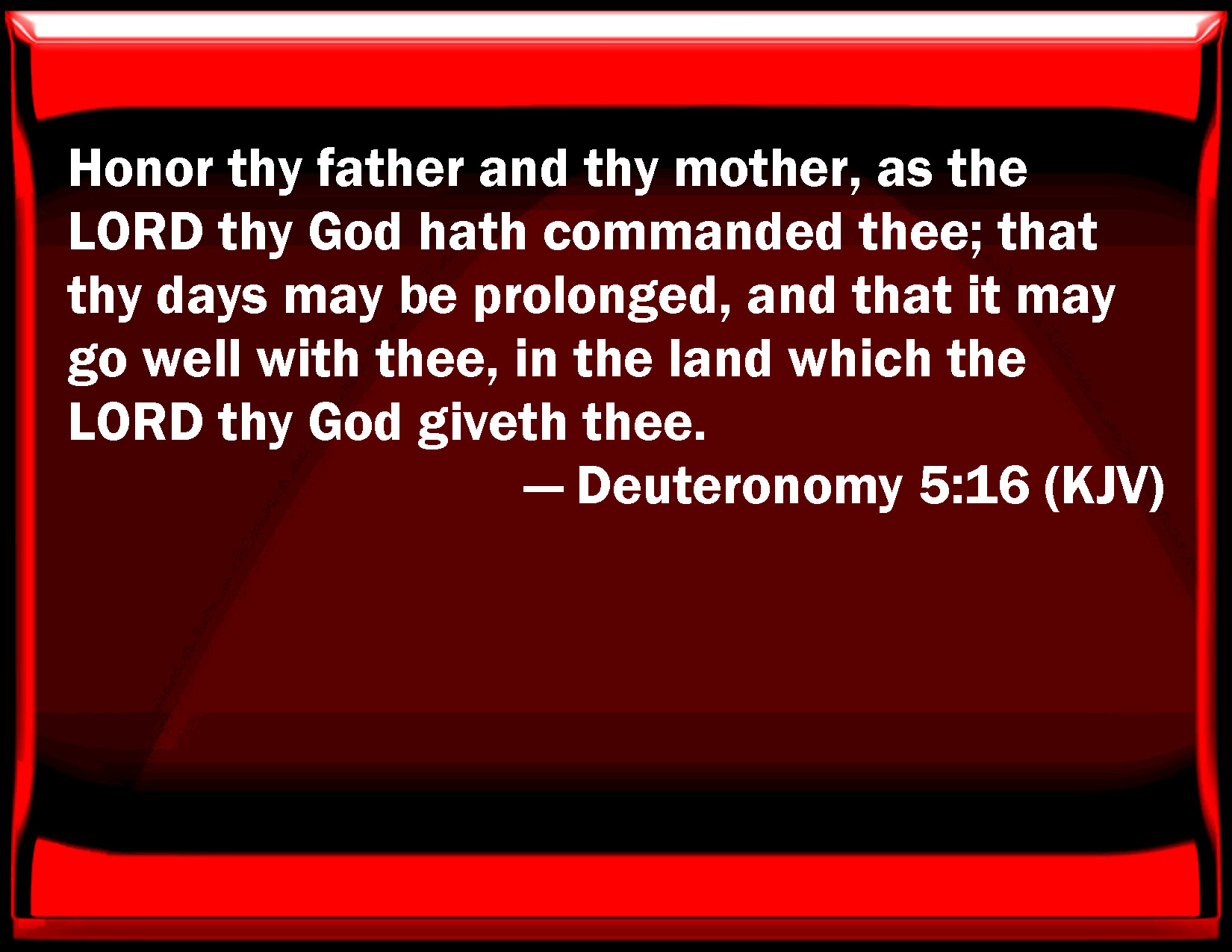 Bible Verse Slide Deuteronomy 5:16 Honor your father and your mother, as the LORD your God has commanded you; that your days may be prolonged, and that it may go well with you, in the land which the LORD your God gives you. KJV: Honour thy father and thy mother, as the LORD thy God hath commanded thee; that thy days may be prolonged, and that it may go well with thee, in the land which the LORD thy God giveth thee. DRB: Honour thy father and mother, as the Lord thy God hath commanded thee, that thou mayst live a long time, and it may be well with thee in the land, which the Lord thy God will give thee. DBT: Honour thy father and thy mother, as Jehovah thy God hath commanded thee; that thy days may be prolonged, and that it may be well with thee in the land which Jehovah thy God giveth thee. ERV: Honour thy father and thy mother, as the LORD thy God commanded thee: that thy days may be long, and that it may go well with thee, upon the land which the LORD thy God giveth thee. WBT: Honor thy father and thy mother, as the LORD thy God hath commanded thee; that thy days may be prolonged, and that it may be well with thee, in the land which the LORD thy God giveth thee. WEB: "Honor your father and your mother, as Yahweh your God commanded you; that your days may be long, and that it may go well with you, in the land which Yahweh your God gives you. YLT: 'Honour thy father and thy mother, as Jehovah thy God hath commanded thee, so that thy days are prolonged, and so that it is well with thee, on the ground which Jehovah thy God is giving to thee.Links Deuteronomy 5:16 NIV • Deuteronomy 5:16 NLT • Deuteronomy 5:16 ESV • Deuteronomy 5:16 NASB • Deuteronomy 5:16 KJV • Deuteronomy 5:16 Interlinear • Deuteronomy 5:16 Commentaries • Deuteronomy 5:16 Parallel Texts • Deuteronomy 5:16 Bible Apps • Deuteronomy 5:16 Parallel • Bible Hub |