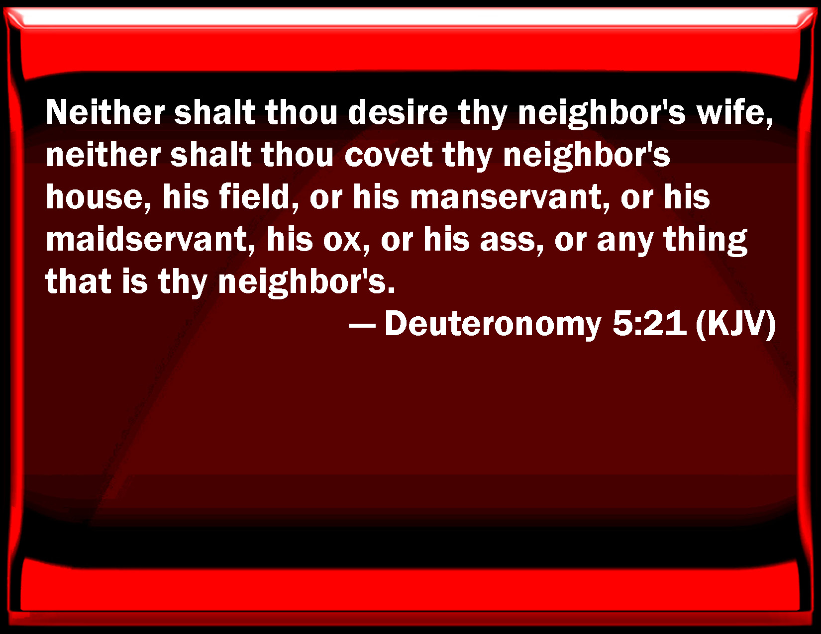 Bible Verse Slide Deuteronomy 5:21 Neither shall you desire your neighbor's wife, neither shall you covet your neighbor's house, his field, or his manservant, or his maidservant, his ox, or his ass, or any thing that is your neighbor's. KJV: Neither shalt thou desire thy neighbour's wife, neither shalt thou covet thy neighbour's house, his field, or his manservant, or his maidservant, his ox, or his ass, or any thing that is thy neighbour's. DRB: Thou shalt not covet thy neighbour's wife: nor his house, nor his field, nor his manservant, nor his maidservant, nor his ox, nor his ass, nor any thing that is his. DBT: Neither shalt thou desire thy neighbour's wife, neither shalt thou covet thy neighbour's house, his field, nor his bondman, nor his handmaid, his ox, nor his ass, nor anything that is thy neighbour's. ERV: Neither shalt thou covet thy neighbour's wife; neither shalt thou desire thy neighbour's house, his field, or his manservant, or his maidservant, his ox, or his ass, or any thing that is thy neighbour's. WBT: Neither shalt thou desire thy neighbor's wife, neither shalt thou covet thy neighbor's house, his field, or his man-servant, or his maid-servant, his ox, or his ass, or any thing that is thy neighbor's. WEB: "Neither shall you covet your neighbor's wife; neither shall you desire your neighbor's house, his field, or his male servant, or his female servant, his ox, or his donkey, or anything that is your neighbor's." YLT: Thou dost not desire thy neighbour's wife; nor dost thou covet thy neighbour's house, his field, and his man-servant, and his handmaid, his ox, and his ass, and anything which is thy neighbour's.Links Deuteronomy 5:21 NIV • Deuteronomy 5:21 NLT • Deuteronomy 5:21 ESV • Deuteronomy 5:21 NASB • Deuteronomy 5:21 KJV • Deuteronomy 5:21 Interlinear • Deuteronomy 5:21 Commentaries • Deuteronomy 5:21 Parallel Texts • Deuteronomy 5:21 Bible Apps • Deuteronomy 5:21 Parallel • Bible Hub |