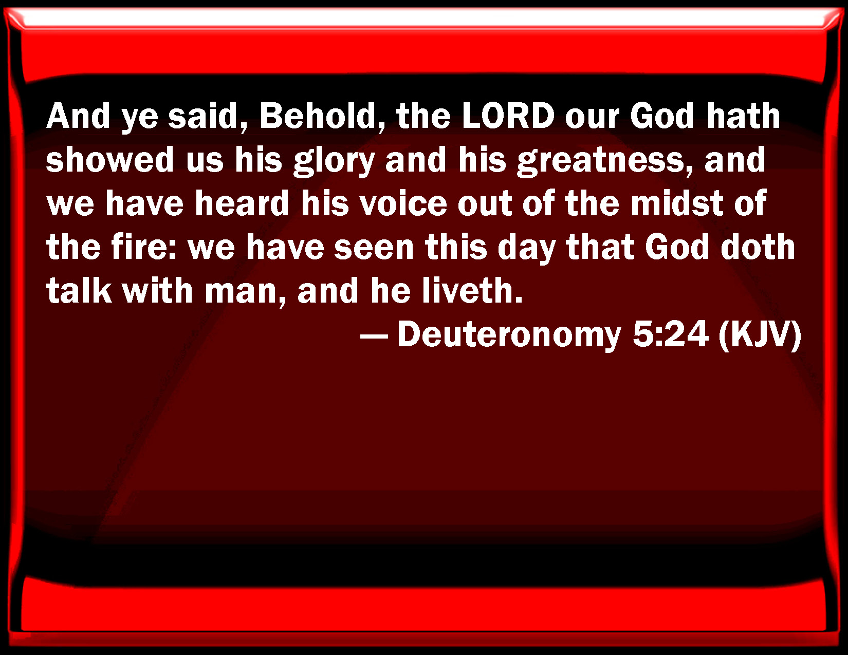 Bible Verse Slide Deuteronomy 5:24 And you said, Behold, the LORD our God has showed us his glory and his greatness, and we have heard his voice out of the middle of the fire: we have seen this day that God does talk with man, and he lives. KJV: And ye said, Behold, the LORD our God hath shewed us his glory and his greatness, and we have heard his voice out of the midst of the fire: we have seen this day that God doth talk with man, and he liveth. DRB: Behold the Lord our God hath shewn us his majesty and his greatness, we have heard his voice out of the midst of the fire, and have proved this day that God speaking with man, man hath lived. DBT: and ye said, Behold, Jehovah our God has shewn us his glory and his greatness, and we have heard his voice from the midst of the fire: we have seen this day that God talks with man, and he lives. ERV: and ye said, Behold, the LORD our God hath shewed us his glory and his greatness, and we have heard his voice out of the midst of the fire: we have seen this day that God doth speak with man, and he liveth. WBT: And ye said, Behold, the LORD our God hath shown us his glory and his greatness, and we have heard his voice from the midst of the fire: we have seen this day that God doth talk with man, and he liveth. WEB: and you said, "Behold, Yahweh our God has shown us his glory and his greatness, and we have heard his voice out of the midst of the fire: we have seen this day that God does speak with man, and he lives. YLT: and say, Lo, Jehovah our God hath shewed us His honour, and His greatness; and His voice we have heard out of the midst of the fire; this day we have seen that God doth speak with man — and he hath lived.Links Deuteronomy 5:24 NIV • Deuteronomy 5:24 NLT • Deuteronomy 5:24 ESV • Deuteronomy 5:24 NASB • Deuteronomy 5:24 KJV • Deuteronomy 5:24 Interlinear • Deuteronomy 5:24 Commentaries • Deuteronomy 5:24 Parallel Texts • Deuteronomy 5:24 Bible Apps • Deuteronomy 5:24 Parallel • Bible Hub |