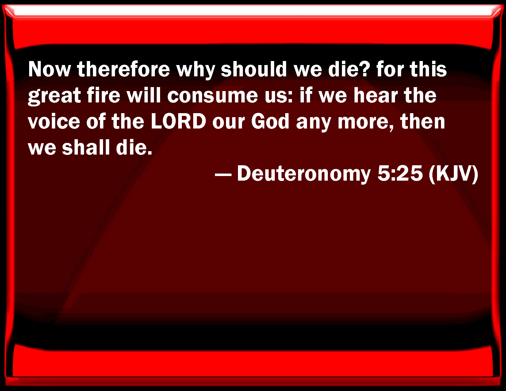 Bible Verse Slide Deuteronomy 5:25 Now therefore why should we die? for this great fire will consume us: if we hear the voice of the LORD our God any more, then we shall die. KJV: Now therefore why should we die? for this great fire will consume us: if we hear the voice of the LORD our God any more, then we shall die. DRB: Why shall we die therefore, and why shall this exceeding great Are consume us: for if we hear the voice of the Lord our God any more, we shall die. DBT: And now, why should we die? for this great fire will consume us. If we hear the voice of Jehovah our God any more, we shall die. ERV: Now therefore why should we die? for this great fire will consume us: if we hear the voice of the LORD our God any more, then we shall die. WBT: Now therefore why should we die? for this great fire will consume us: if we hear the voice of the LORD our God any more, then we shall die. WEB: Now therefore why should we die? For this great fire will consume us: if we hear the voice of Yahweh our God any more, then we shall die. YLT: And, now, why do we die? for consume us doth this great fire — if we add to hear the voice of Jehovah our God any more — then we have died.Links Deuteronomy 5:25 NIV • Deuteronomy 5:25 NLT • Deuteronomy 5:25 ESV • Deuteronomy 5:25 NASB • Deuteronomy 5:25 KJV • Deuteronomy 5:25 Interlinear • Deuteronomy 5:25 Commentaries • Deuteronomy 5:25 Parallel Texts • Deuteronomy 5:25 Bible Apps • Deuteronomy 5:25 Parallel • Bible Hub |