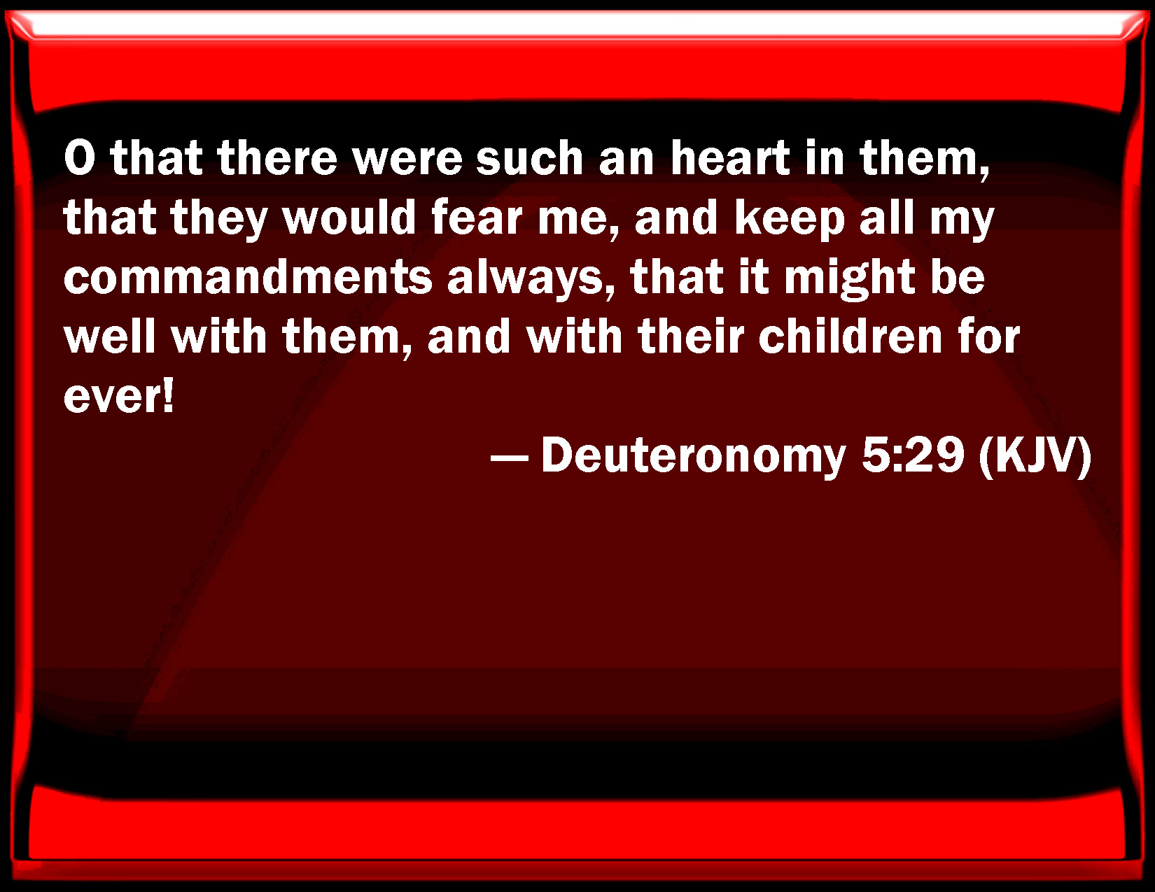 Bible Verse Slide Deuteronomy 5:29 O that there were such an heart in them, that they would fear me, and keep all my commandments always, that it might be well with them, and with their children for ever! KJV: O that there were such an heart in them, that they would fear me, and keep all my commandments always, that it might be well with them, and with their children for ever! DRB: Who shall give them to have such a mind, to fear me, and to keep all my commandments at all times, that it may be well with them and with their children for ever? DBT: Oh that there were such a heart in them, that they would fear me, and keep all my commandments continually, that it might be well with them and with their sons for ever! ERV: Oh that there were such an heart in them, that they would fear me, and keep all my commandments always, that it might be well with them, and with their children for ever! WBT: O that there were such a heart in them, that they would fear me, and keep all my commandments always, that it might be well with them, and with their children for ever! WEB: Oh that there were such a heart in them, that they would fear me, and keep all my commandments always, that it might be well with them, and with their children forever! YLT: O that their heart had been thus to them, to fear Me, and to keep My commands all the days, that it may be well with them, and with their sons — to the age!Links Deuteronomy 5:29 NIV • Deuteronomy 5:29 NLT • Deuteronomy 5:29 ESV • Deuteronomy 5:29 NASB • Deuteronomy 5:29 KJV • Deuteronomy 5:29 Interlinear • Deuteronomy 5:29 Commentaries • Deuteronomy 5:29 Parallel Texts • Deuteronomy 5:29 Bible Apps • Deuteronomy 5:29 Parallel • Bible Hub |