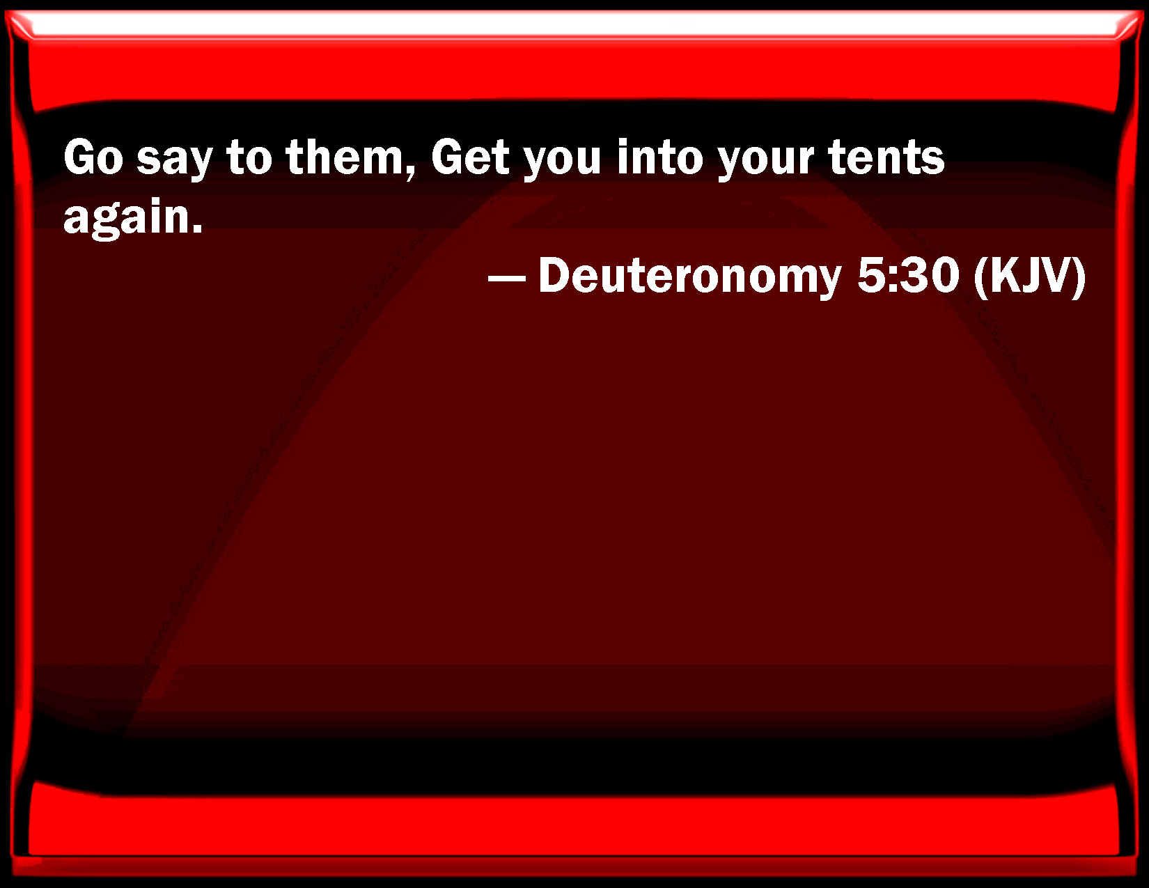 Bible Verse Slide Deuteronomy 5:30 Go say to them, Get you into your tents again. KJV: Go say to them, Get you into your tents again. DRB: Go and say to them: Return into your tents. DBT: Go, say unto them, Get you into your tents again. ERV: Go say to them, Return ye to your tents. WBT: Go, say to them, Return to your tents again. WEB: "Go tell them, Return to your tents. YLT: 'Go, say to them, Turn back for yourselves, to your tents;Links Deuteronomy 5:30 NIV • Deuteronomy 5:30 NLT • Deuteronomy 5:30 ESV • Deuteronomy 5:30 NASB • Deuteronomy 5:30 KJV • Deuteronomy 5:30 Interlinear • Deuteronomy 5:30 Commentaries • Deuteronomy 5:30 Parallel Texts • Deuteronomy 5:30 Bible Apps • Deuteronomy 5:30 Parallel • Bible Hub |