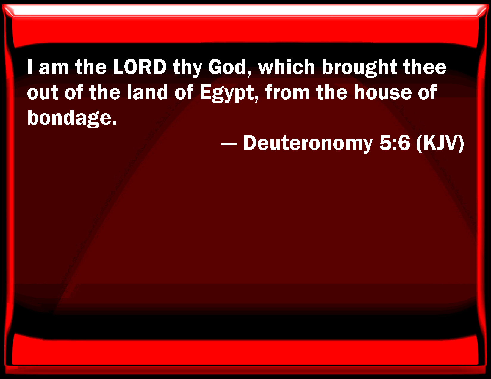 Bible Verse Slide Deuteronomy 5:6 I am the LORD your God, which brought you out of the land of Egypt, from the house of bondage. KJV: I am the LORD thy God, which brought thee out of the land of Egypt, from the house of bondage. DRB: I am the Lord thy God, who brought thee out of the land of Egypt, out of the house of bondage DBT: I am Jehovah thy God who have brought thee out of the land of Egypt, out of the house of bondage. ERV: I am the LORD thy God, which brought thee out of the land of Egypt, out of the house of bondage. WBT: I am the LORD thy God, who brought thee out of the land of Egypt, from the house of bondage. WEB: "I am Yahweh your God, who brought you out of the land of Egypt, out of the house of bondage. YLT: I Jehovah am thy God, who hath brought thee out from the land of Egypt, from a house of servants.Links Deuteronomy 5:6 NIV • Deuteronomy 5:6 NLT • Deuteronomy 5:6 ESV • Deuteronomy 5:6 NASB • Deuteronomy 5:6 KJV • Deuteronomy 5:6 Interlinear • Deuteronomy 5:6 Commentaries • Deuteronomy 5:6 Parallel Texts • Deuteronomy 5:6 Bible Apps • Deuteronomy 5:6 Parallel • Bible Hub |
