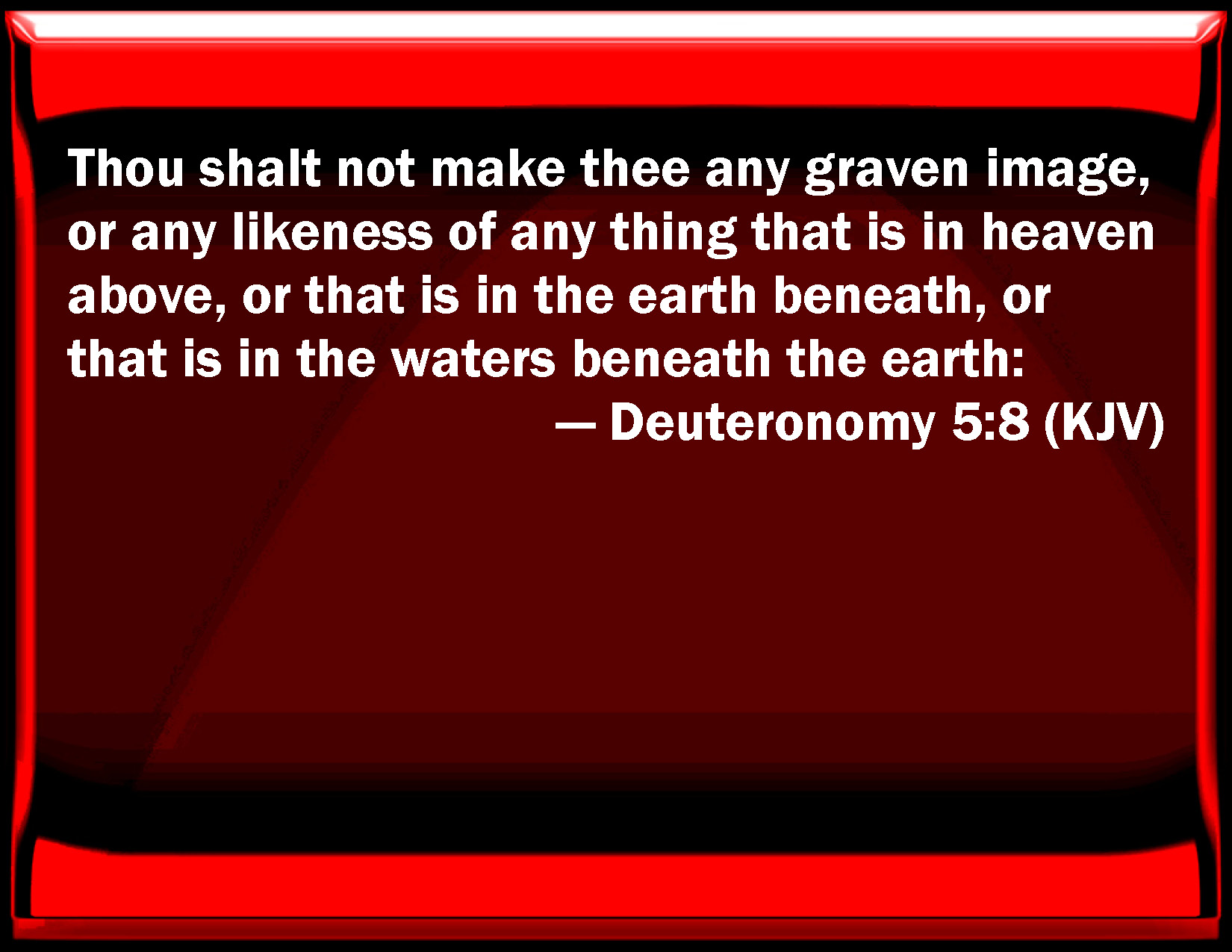 Bible Verse Slide Deuteronomy 5:8 You shall not make you any graven image, or any likeness of any thing that is in heaven above, or that is in the earth beneath, or that is in the waters beneath the earth: KJV: Thou shalt not make thee any graven image, or any likeness of any thing that is in heaven above, or that is in the earth beneath, or that is in the waters beneath the earth: DRB: Thou shalt not make to thyself a graven thing, nor the likeness of any things, that are in heaven above, or that are in the earth beneath, or that abide in the waters under the earth. DBT: Thou shalt not make thyself any graven image, any form of what is in the heavens above, or what is in the earth beneath, or what is in the waters under the earth: ERV: Thou shalt not make unto thee a graven image, the likeness of any form that is in heaven above, or that is in the earth beneath, or that is in the water under the earth: WBT: Thou shalt not make for thee any graven image, or any likeness of any thing that is in heaven above, or that is on the earth beneath, or that is in the waters beneath the earth: WEB: "You shall not make an engraved image for yourself, [nor] any likeness [of anything] that is in heaven above, or that is in the earth beneath, or that is in the water under the earth: YLT: Thou dost not make to thee a graven image, any similitude which is in the heavens above, and which is in the earth beneath, and which is in the waters under the earth;Links Deuteronomy 5:8 NIV • Deuteronomy 5:8 NLT • Deuteronomy 5:8 ESV • Deuteronomy 5:8 NASB • Deuteronomy 5:8 KJV • Deuteronomy 5:8 Interlinear • Deuteronomy 5:8 Commentaries • Deuteronomy 5:8 Parallel Texts • Deuteronomy 5:8 Bible Apps • Deuteronomy 5:8 Parallel • Bible Hub |
