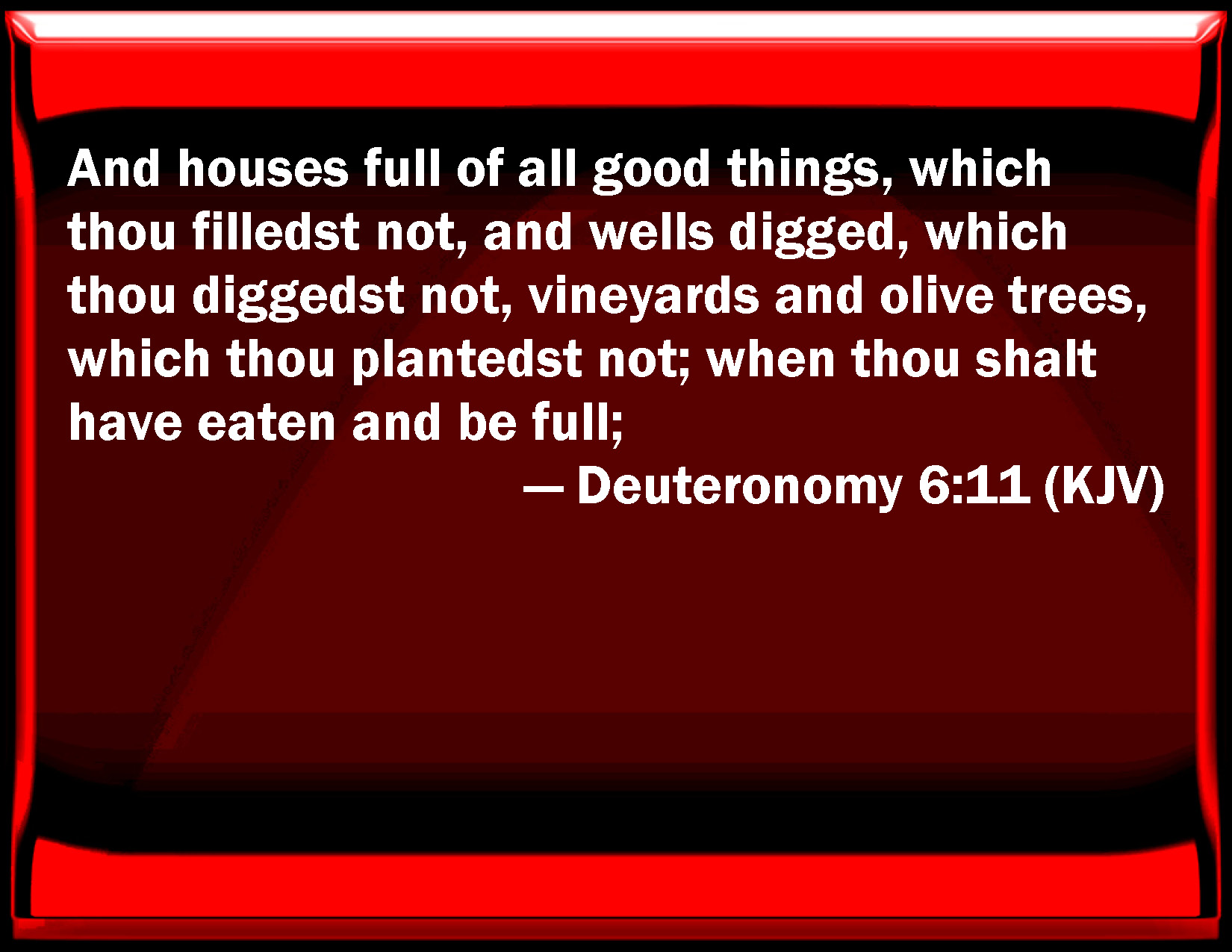 Bible Verse Slide Deuteronomy 6:11 And houses full of all good things, which you filled not, and wells dig, which you digged not, vineyards and olive trees, which you planted not; when you shall have eaten and be full; KJV: And houses full of all good things, which thou filledst not, and wells digged, which thou diggedst not, vineyards and olive trees, which thou plantedst not; when thou shalt have eaten and be full; DRB: Houses full of riches, which thou didst not set up, cisterns which thou didst not dig, vineyards and oliveyards, which thou didst not plant, DBT: and houses full of everything good which thou filledst not, and wells digged which thou diggedst not, vineyards and oliveyards which thou plantedst not, and thou shalt have eaten and shalt be full; ERV: and houses full of all good things, which thou filledst not, and cisterns hewn out, which thou hewedst not, vineyards and olive trees, which thou plantedst not, and thou shalt eat and be full; WBT: And houses full of all good things, which thou didst not fill, and wells digged, which thou didst not dig, vineyards and olive-trees, which thou didst not plant; when thou shalt have eaten and be full; WEB: and houses full of all good things, which you didn't fill, and cisterns dug out, which you didn't dig, vineyards and olive trees, which you didn't plant, and you shall eat and be full; YLT: and houses full of all good things which thou hast not filled, and wells digged which thou hast not digged, vineyards and olive-yards which thou hast not planted, and thou hast eaten, and been satisfied;Links Deuteronomy 6:11 NIV • Deuteronomy 6:11 NLT • Deuteronomy 6:11 ESV • Deuteronomy 6:11 NASB • Deuteronomy 6:11 KJV • Deuteronomy 6:11 Interlinear • Deuteronomy 6:11 Commentaries • Deuteronomy 6:11 Parallel Texts • Deuteronomy 6:11 Bible Apps • Deuteronomy 6:11 Parallel • Bible Hub |