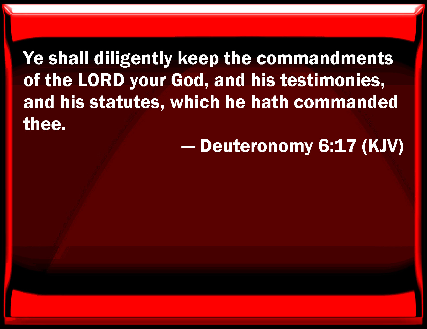 Bible Verse Slide Deuteronomy 6:17 You shall diligently keep the commandments of the LORD your God, and his testimonies, and his statutes, which he has commanded you. KJV: Ye shall diligently keep the commandments of the LORD your God, and his testimonies, and his statutes, which he hath commanded thee. DRB: Keep the precepts of the Lord thy God, and the testimonies and ceremonies which he hath commanded thee. DBT: Ye shall diligently keep the commandments of Jehovah your God, and his testimonies, and his statutes, which he hath commanded thee. ERV: Ye shall diligently keep the commandments of the LORD your God, and his testimonies, and his statutes, which he hath commanded thee. WBT: Ye shall diligently keep the commandments of the LORD your God, and his testimonies, and his statutes, which he hath commanded thee. WEB: You shall diligently keep the commandments of Yahweh your God, and his testimonies, and his statutes, which he has commanded you. YLT: ye do diligently keep the commands of Jehovah your God, and His testimonies, and His statutes which He hath commanded thee,Links Deuteronomy 6:17 NIV • Deuteronomy 6:17 NLT • Deuteronomy 6:17 ESV • Deuteronomy 6:17 NASB • Deuteronomy 6:17 KJV • Deuteronomy 6:17 Interlinear • Deuteronomy 6:17 Commentaries • Deuteronomy 6:17 Parallel Texts • Deuteronomy 6:17 Bible Apps • Deuteronomy 6:17 Parallel • Bible Hub |