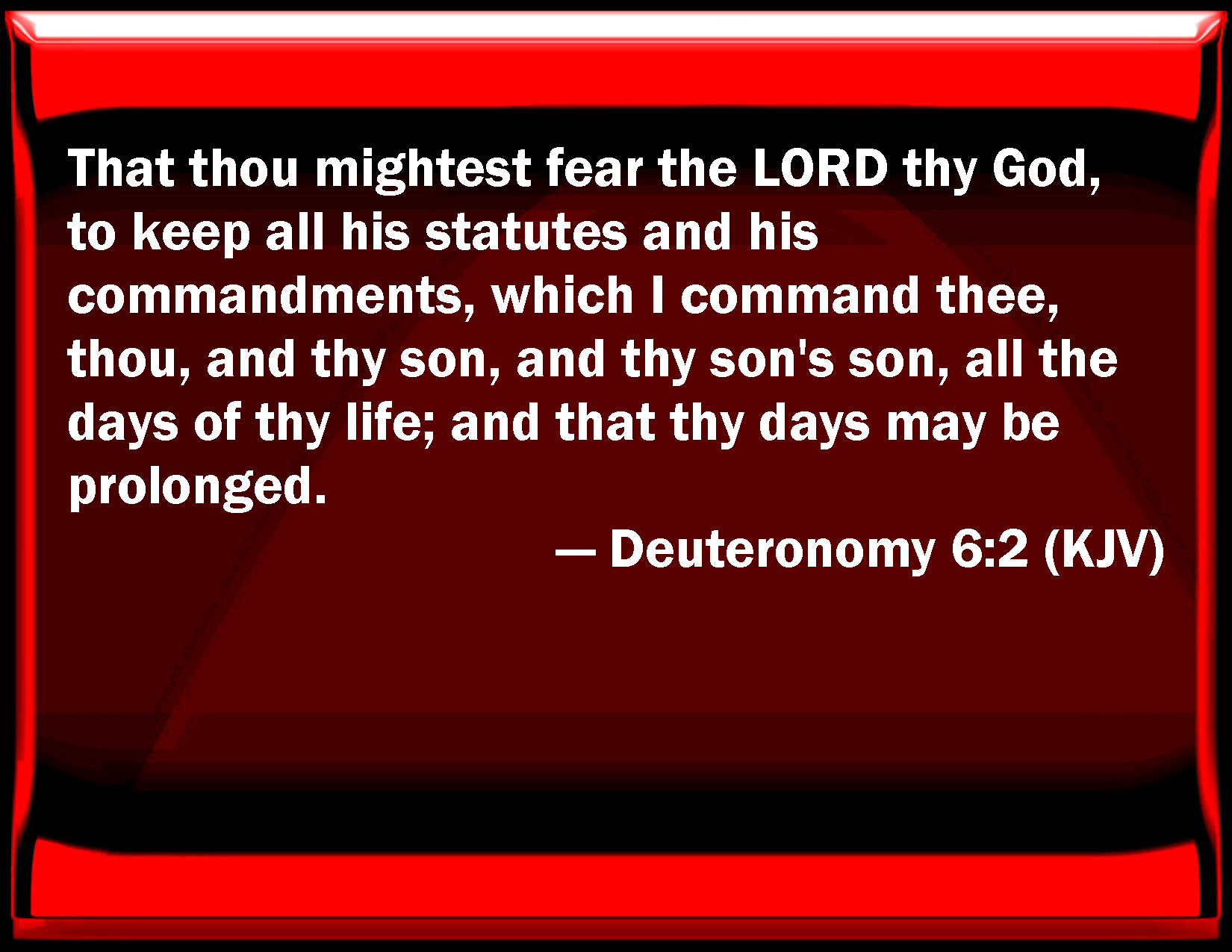 Bible Verse Slide Deuteronomy 6:2 That you might fear the LORD your God, to keep all his statutes and his commandments, which I command you, you, and your son, and your son's son, all the days of your life; and that your days may be prolonged. KJV: That thou mightest fear the LORD thy God, to keep all his statutes and his commandments, which I command thee, thou, and thy son, and thy son's son, all the days of thy life; and that thy days may be prolonged. DRB: That thou mayst fear the Lord thy God, and keep all his commandments and precepts, which I command thee, and thy sons, and thy grandsons, all the days of thy life, that thy days may be prolonged. DBT: that thou mayest fear Jehovah thy God, to keep all his statutes and his commandments which I command thee, thou, and thy son, and thy son's son, all the days of thy life; and that thy days may be prolonged. ERV: that thou mightest fear the LORD thy God, to keep all his statutes and his commandments, which I command thee, thou, and thy son, and thy son's son, all the days of thy life; and that thy days may be prolonged. WBT: That thou mayst fear the LORD thy God, to keep all his statutes and his commandments which I command thee, thou, and thy son, and thy son's son, all the days of thy life: and that thy days may be prolonged. WEB: that you might fear Yahweh your God, to keep all his statutes and his commandments, which I command you, you, and your son, and your son's son, all the days of your life; and that your days may be prolonged. YLT: so that thou dost fear Jehovah thy God, to keep all His statutes and His commands, which I am commanding thee, thou, and thy son, and thy son's son, all days of thy life, and so that thy days are prolonged.Links Deuteronomy 6:2 NIV • Deuteronomy 6:2 NLT • Deuteronomy 6:2 ESV • Deuteronomy 6:2 NASB • Deuteronomy 6:2 KJV • Deuteronomy 6:2 Interlinear • Deuteronomy 6:2 Commentaries • Deuteronomy 6:2 Parallel Texts • Deuteronomy 6:2 Bible Apps • Deuteronomy 6:2 Parallel • Bible Hub |