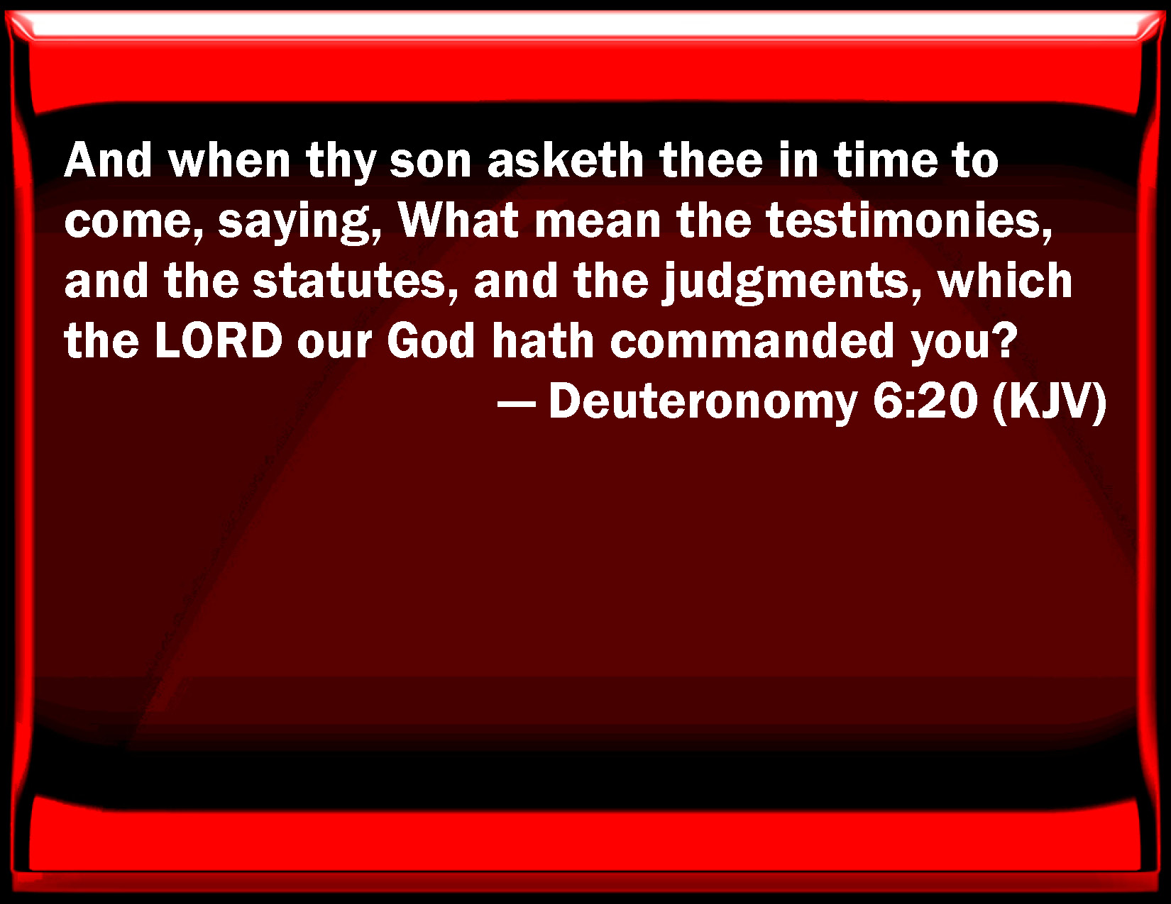 Bible Verse Slide Deuteronomy 6:20 And when your son asks you in time to come, saying, What mean the testimonies, and the statutes, and the judgments, which the LORD our God has commanded you? KJV: And when thy son asketh thee in time to come, saying, What mean the testimonies, and the statutes, and the judgments, which the LORD our God hath commanded you? DRB: And when thy son shall ask thee to morrow, saying: What mean these testimonies, and ceremonies and judgments, which the Lord our God hath commanded us? DBT: When thy son shall ask thee in time to come, saying, What are the testimonies, and the statutes, and the ordinances, which Jehovah our God hath commanded you? ERV: When thy son asketh thee in time to come, saying, What mean the testimonies, and the statutes, and the judgments, which the LORD our God hath commanded you? WBT: And when thy son shall ask thee in time to come, saying, What mean the testimonies, and the statutes, and the judgments, which the LORD our God hath commanded you? WEB: When your son asks you in time to come, saying, "What do the testimonies, the statutes, and the ordinances, which Yahweh our God has commanded you mean?" YLT: When thy son asketh thee hereafter, saying, What are the testimonies, and the statutes, and the judgments, which Jehovah our God hath commanded you?Links Deuteronomy 6:20 NIV • Deuteronomy 6:20 NLT • Deuteronomy 6:20 ESV • Deuteronomy 6:20 NASB • Deuteronomy 6:20 KJV • Deuteronomy 6:20 Interlinear • Deuteronomy 6:20 Commentaries • Deuteronomy 6:20 Parallel Texts • Deuteronomy 6:20 Bible Apps • Deuteronomy 6:20 Parallel • Bible Hub |