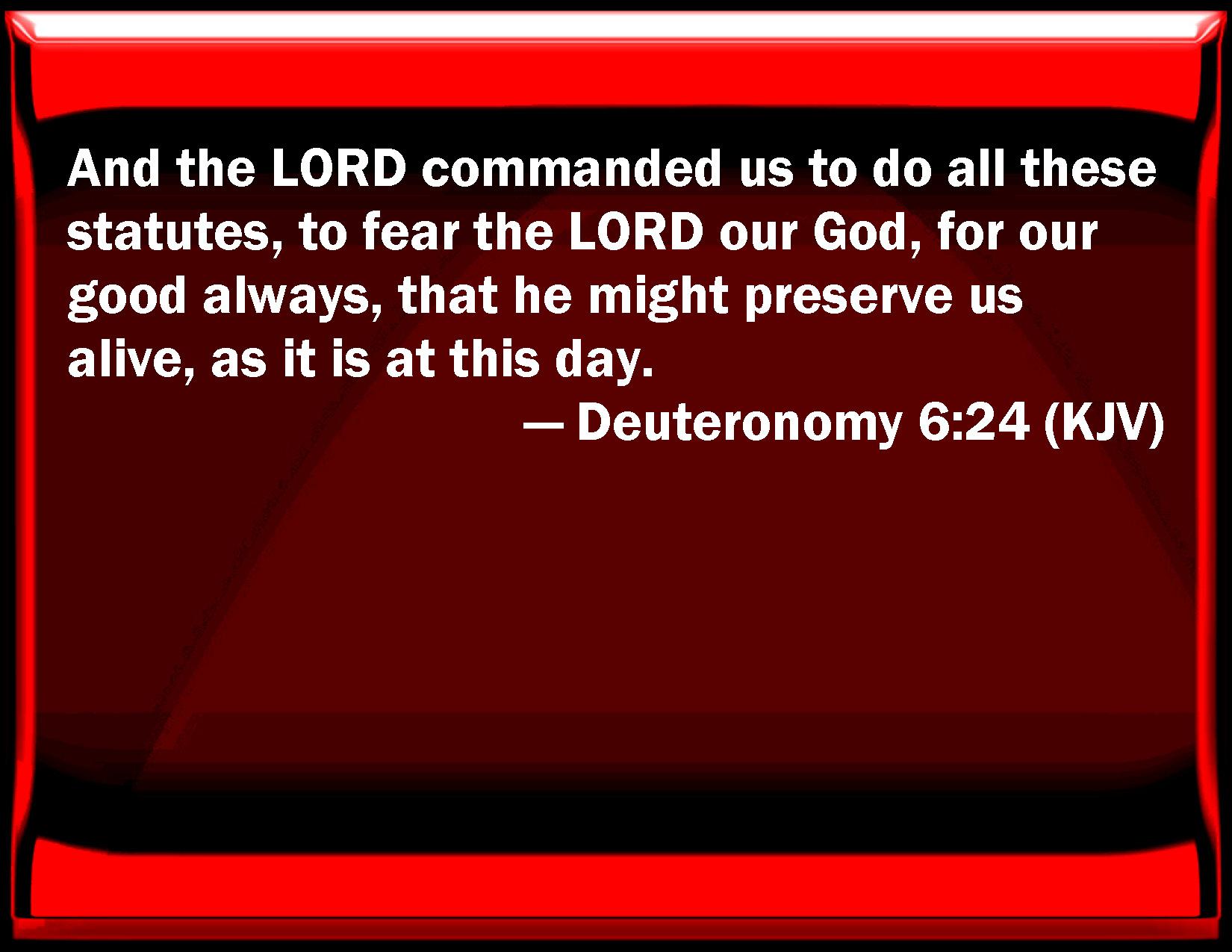 Bible Verse Slide Deuteronomy 6:24 And the LORD commanded us to do all these statutes, to fear the LORD our God, for our good always, that he might preserve us alive, as it is at this day. KJV: And the LORD commanded us to do all these statutes, to fear the LORD our God, for our good always, that he might preserve us alive, as it is at this day. DRB: And the Lord commanded that we should do all these ordinances, and should fear the Lord our God, that it might be well with us all the days of our life, as it is at this day. DBT: And Jehovah commanded us to do all these statutes, to fear Jehovah our God, for our good continually, that he might preserve us alive, as it is this day. ERV: And the LORD commanded us to do all these statutes, to fear the LORD our God, for our good always, that he might preserve us alive, as at this day. WBT: And the LORD commanded us to do all these statutes, to fear the LORD our God, for our good always, that he might preserve us alive, as it is at this day. WEB: Yahweh commanded us to do all these statutes, to fear Yahweh our God, for our good always, that he might preserve us alive, as at this day. YLT: And Jehovah commandeth us to do all these statutes, to fear Jehovah our God, for good to ourselves all the days, to keep us alive, as at this day;Links Deuteronomy 6:24 NIV • Deuteronomy 6:24 NLT • Deuteronomy 6:24 ESV • Deuteronomy 6:24 NASB • Deuteronomy 6:24 KJV • Deuteronomy 6:24 Interlinear • Deuteronomy 6:24 Commentaries • Deuteronomy 6:24 Parallel Texts • Deuteronomy 6:24 Bible Apps • Deuteronomy 6:24 Parallel • Bible Hub |