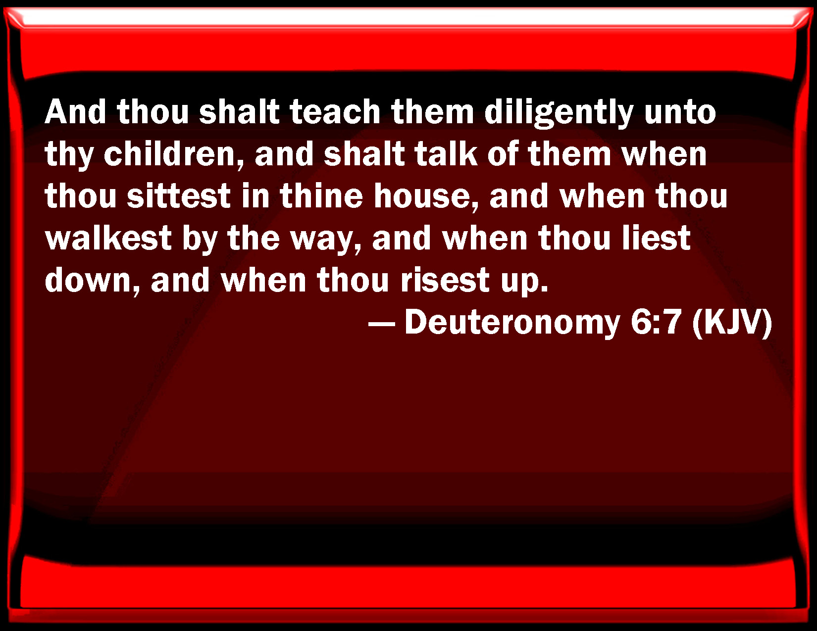 Bible Verse Slide Deuteronomy 6:7 And you shall teach them diligently to your children, and shall talk of them when you sit in your house, and when you walk by the way, and when you lie down, and when you rise up. KJV: And thou shalt teach them diligently unto thy children, and shalt talk of them when thou sittest in thine house, and when thou walkest by the way, and when thou liest down, and when thou risest up. DRB: And thou shalt tell them to thy children, and thou shalt meditate upon them sitting in thy house, and walking on thy journey, sleeping and rising. DBT: and thou shalt impress them on thy sons, and shalt talk of them when thou sittest in thy house, and when thou goest on the way, and when thou liest down, and when thou risest up. ERV: and thou shalt teach them diligently unto thy children, and shalt talk of them when thou sittest in thine house, and when thou walkest by the way, and when thou liest down, and when thou risest up. WBT: And thou shalt teach them diligently to thy children, and shalt talk of them when thou sittest in thy house, and when thou walkest by the way, and when thou liest down, and when thou risest up. WEB: and you shall teach them diligently to your children, and shall talk of them when you sit in your house, and when you walk by the way, and when you lie down, and when you rise up. YLT: and thou hast repeated them to thy sons, and spoken of them in thy sitting in thine house, and in thy walking in the way, and in thy lying down, and in thy rising up,Links Deuteronomy 6:7 NIV • Deuteronomy 6:7 NLT • Deuteronomy 6:7 ESV • Deuteronomy 6:7 NASB • Deuteronomy 6:7 KJV • Deuteronomy 6:7 Interlinear • Deuteronomy 6:7 Commentaries • Deuteronomy 6:7 Parallel Texts • Deuteronomy 6:7 Bible Apps • Deuteronomy 6:7 Parallel • Bible Hub |