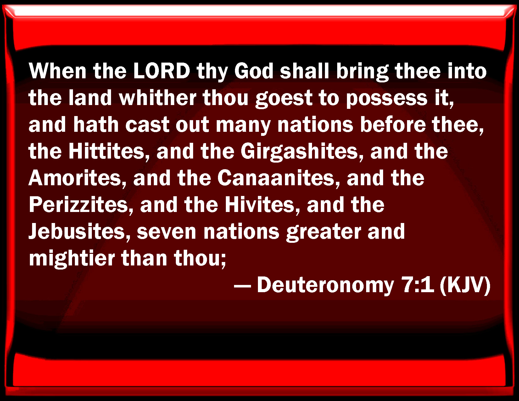 Bible Verse Slide Deuteronomy 7:1 When the LORD your God shall bring you into the land where you go to possess it, and has cast out many nations before you, the Hittites, and the Girgashites, and the Amorites, and the Canaanites, and the Perizzites, and the Hivites, and the Jebusites, seven nations greater and mightier than you; KJV: When the LORD thy God shall bring thee into the land whither thou goest to possess it, and hath cast out many nations before thee, the Hittites, and the Girgashites, and the Amorites, and the Canaanites, and the Perizzites, and the Hivites, and the Jebusites, seven nations greater and mightier than thou; DRB: When the Lord thy God shall have brought thee into the land, which thou art going in to possess, and shall have destroyed many nations before thee, the Hethite, and the Gergezite, and the Amorrhite, and the Chanaanite, and the Pherezite, and the Hevite, and the Jebusite, seven nations much more numerous than thou art, and stronger than thou: DBT: When Jehovah thy God shall bring thee into the land whither thou goest to possess it, and shall cast out many nations from before thee, the Hittites, and the Girgashites, and the Amorites, and the Canaanites, and the Perizzites, and the Hivites, and the Jebusites, seven nations greater and mightier than thou, ERV: When the LORD thy God shall bring thee into the land whither thou goest to possess it, and shall cast out many nations before thee, the Hittite, and the Girgashite, and the Amorite, and the Canaanite, and the Perizzite, and the Hivite, and the Jebusite, seven nations greater and mightier than thou; WBT: When the LORD thy God shall bring thee into the land whither thou goest to possess it, and hath cast out many nations before thee, the Hittites, and the Girgashites, and the Amorites, and the Canaanites, and the Perrizites, and the Hivites, and the Jebusites, seven nations greater and mightier than thou; WEB: When Yahweh your God shall bring you into the land where you go to possess it, and shall cast out many nations before you, the Hittite, and the Girgashite, and the Amorite, and the Canaanite, and the Perizzite, and the Hivite, and the Jebusite, seven nations greater and mightier than you; YLT: 'When Jehovah thy God doth bring thee in unto the land whither thou art going in to possess it, and He hath cast out many nations from thy presence, the Hittite, and the Girgashite, and the Amorite, and the Canaanite, and the Perizzite, and the Hivite, and the Jebusite, seven nations more numerous and mighty than thou,Links Deuteronomy 7:1 NIV • Deuteronomy 7:1 NLT • Deuteronomy 7:1 ESV • Deuteronomy 7:1 NASB • Deuteronomy 7:1 KJV • Deuteronomy 7:1 Interlinear • Deuteronomy 7:1 Commentaries • Deuteronomy 7:1 Parallel Texts • Deuteronomy 7:1 Bible Apps • Deuteronomy 7:1 Parallel • Bible Hub |