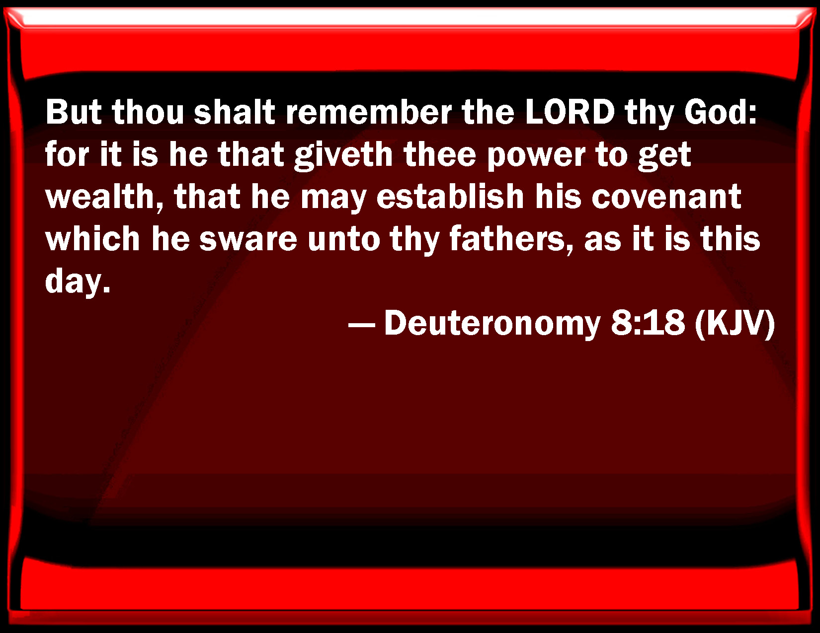 Bible Verse Slide Deuteronomy 8:18 But you shall remember the LORD your God: for it is he that gives you power to get wealth, that he may establish his covenant which he swore to your fathers, as it is this day. KJV: But thou shalt remember the LORD thy God: for it is he that giveth thee power to get wealth, that he may establish his covenant which he sware unto thy fathers, as it is this day. DRB: But remember the Lord thy God, that he hath given thee strength, that he might fulfil his covenant, concerning which he swore to thy fathers, as this present day sheweth. DBT: But thou shalt remember Jehovah thy God, that it is he who giveth thee power to get wealth, that he may establish his covenant which he swore unto thy fathers, as it is this day. ERV: But thou shalt remember the LORD thy God, for it is he that giveth thee power to get wealth; that he may establish his covenant which he sware unto thy fathers, as at this day. WBT: But thou shalt remember the LORD thy God: for it is he that giveth thee power to get wealth, that he may establish his covenant which he swore to thy fathers, as it is this day. WEB: But you shall remember Yahweh your God, for it is he who gives you power to get wealth; that he may establish his covenant which he swore to your fathers, as at this day. YLT: And thou hast remembered Jehovah thy God, for He it is who is giving to thee power to make wealth, in order to establish His covenant which He hath sworn to thy fathers as at this day.Links Deuteronomy 8:18 NIV • Deuteronomy 8:18 NLT • Deuteronomy 8:18 ESV • Deuteronomy 8:18 NASB • Deuteronomy 8:18 KJV • Deuteronomy 8:18 Interlinear • Deuteronomy 8:18 Commentaries • Deuteronomy 8:18 Parallel Texts • Deuteronomy 8:18 Bible Apps • Deuteronomy 8:18 Parallel • Bible Hub |