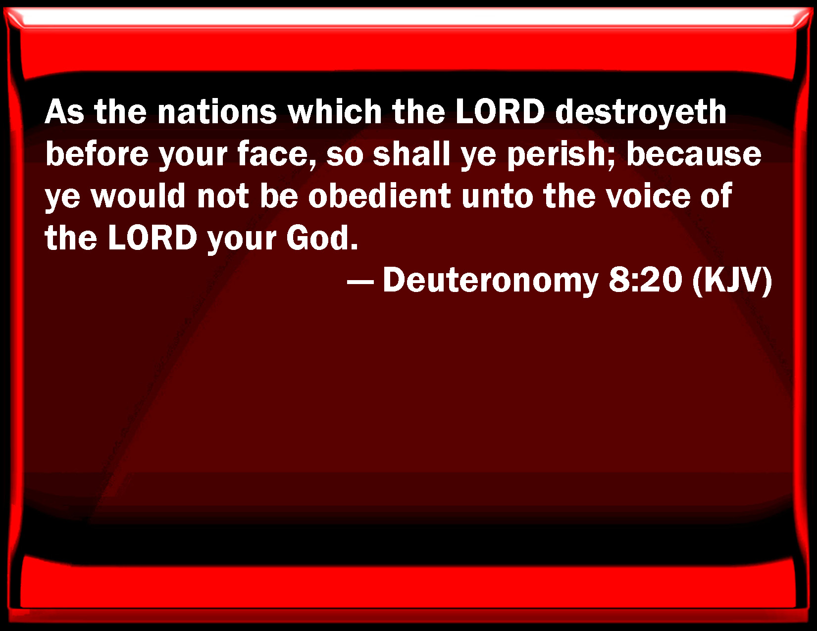 Bible Verse Slide Deuteronomy 8:20 As the nations which the LORD destroys before your face, so shall you perish; because you would not be obedient to the voice of the LORD your God. KJV: As the nations which the LORD destroyeth before your face, so shall ye perish; because ye would not be obedient unto the voice of the LORD your God. DRB: As the nations, which the Lord destroyed at thy entrance, so shall you also perish, if you be disobedient to the voice of the Lord your God. DBT: As the nations which Jehovah is causing to perish before you, so shall ye perish; because ye would not hearken unto the voice of Jehovah your God. ERV: As the nations which the LORD maketh to perish before you, so shall ye perish; because ye would not hearken unto the voice of the LORD your God. WBT: As the nations which the LORD destroyeth before your face, so shall ye perish; because ye would not be obedient to the voice of the LORD your God. WEB: As the nations that Yahweh makes to perish before you, so you shall perish; because you wouldn't listen to the voice of Yahweh your God. YLT: as the nations whom Jehovah is destroying from your presence, so ye perish; because ye hearken not to the voice of Jehovah your God.Links Deuteronomy 8:20 NIV • Deuteronomy 8:20 NLT • Deuteronomy 8:20 ESV • Deuteronomy 8:20 NASB • Deuteronomy 8:20 KJV • Deuteronomy 8:20 Interlinear • Deuteronomy 8:20 Commentaries • Deuteronomy 8:20 Parallel Texts • Deuteronomy 8:20 Bible Apps • Deuteronomy 8:20 Parallel • Bible Hub |