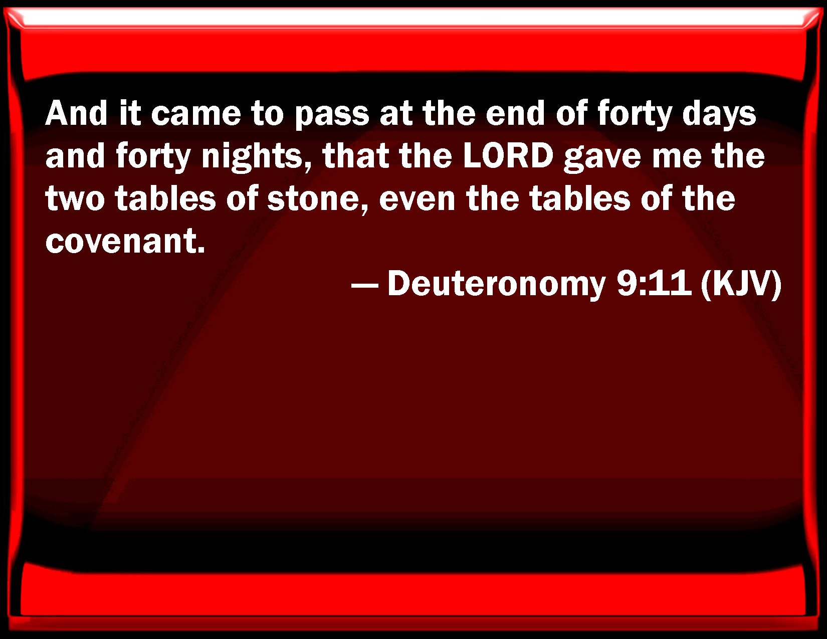 Bible Verse Slide Deuteronomy 9:11 And it came to pass at the end of forty days and forty nights, that the LORD gave me the two tables of stone, even the tables of the covenant. KJV: And it came to pass at the end of forty days and forty nights, that the LORD gave me the two tables of stone, even the tables of the covenant. DRB: And when forty days were passed, and as many nights, the Lord gave me the two tables of stone, the tables of the covenant, DBT: And it came to pass at the end of forty days and forty nights, that Jehovah gave me the two tables of stone, the tables of the covenant. ERV: And it came to pass at the end of forty days and forty nights, that the LORD gave me the two tables of stone, even the tables of the covenant. WBT: And it came to pass at the end of forty days and forty nights, that the LORD gave me the two tables of stone, even the tables of the covenant. WEB: It came to pass at the end of forty days and forty nights, that Yahweh gave me the two tables of stone, even the tables of the covenant. YLT: And it cometh to pass, at the end of forty days and forty nights, Jehovah hath given unto me the two tables of stone — tables of the covenant,Links Deuteronomy 9:11 NIV • Deuteronomy 9:11 NLT • Deuteronomy 9:11 ESV • Deuteronomy 9:11 NASB • Deuteronomy 9:11 KJV • Deuteronomy 9:11 Interlinear • Deuteronomy 9:11 Commentaries • Deuteronomy 9:11 Parallel Texts • Deuteronomy 9:11 Bible Apps • Deuteronomy 9:11 Parallel • Bible Hub |