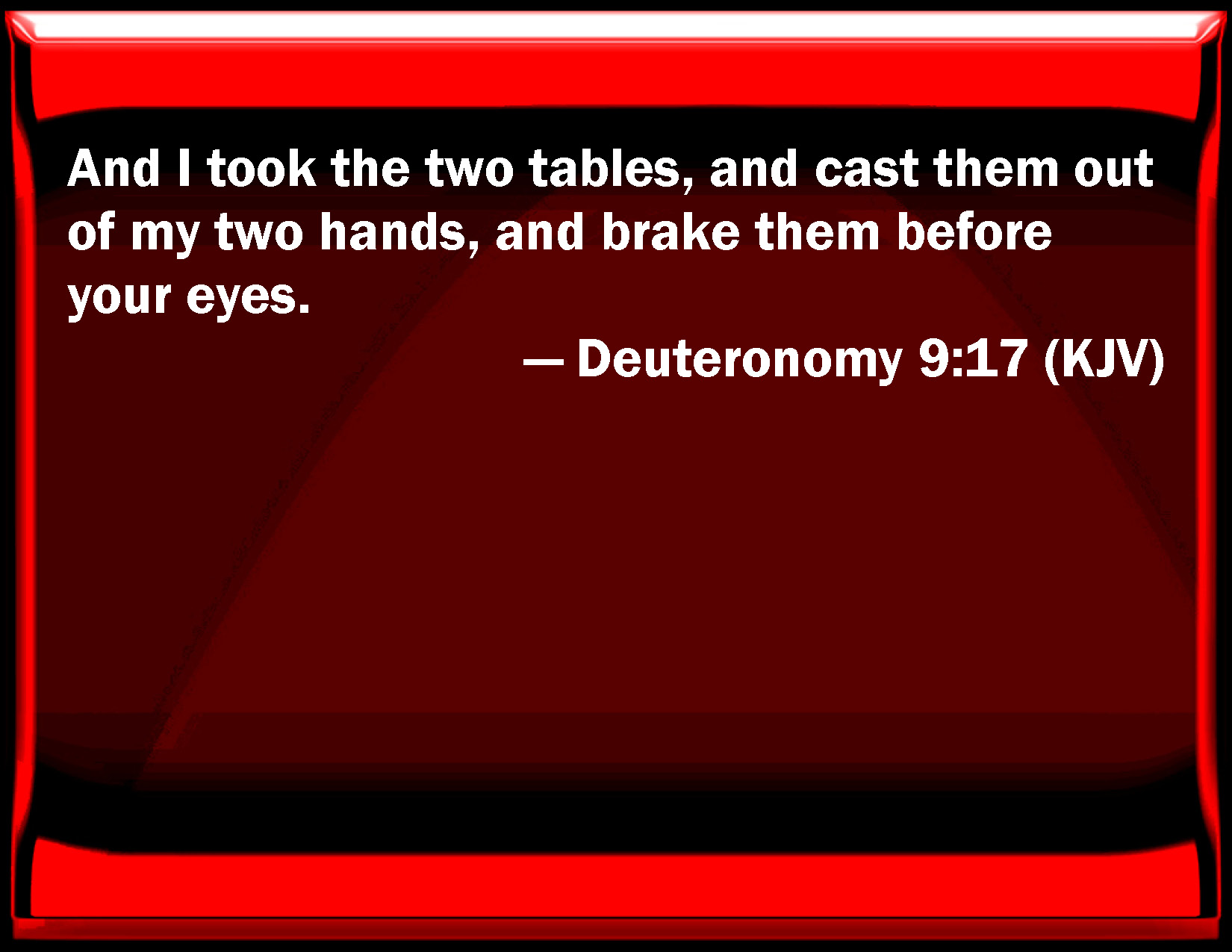 Bible Verse Slide Deuteronomy 9:17 And I took the two tables, and cast them out of my two hands, and broke them before your eyes. KJV: And I took the two tables, and cast them out of my two hands, and brake them before your eyes. DRB: I cast the tables out of my hands, and broke them in your sight. DBT: And I seized the two tables, and cast them out of my two hands, and broke them before your eyes. ERV: And I took hold of the two tables, and cast them out of my two hands, and brake them before your eyes. WBT: And I took the two tables, and cast them out of my two hands, and broke them before your eyes. WEB: I took hold of the two tables, and cast them out of my two hands, and broke them before your eyes. YLT: 'And I lay hold on the two tables, and cast them out of my two hands, and break them before your eyes,Links Deuteronomy 9:17 NIV • Deuteronomy 9:17 NLT • Deuteronomy 9:17 ESV • Deuteronomy 9:17 NASB • Deuteronomy 9:17 KJV • Deuteronomy 9:17 Interlinear • Deuteronomy 9:17 Commentaries • Deuteronomy 9:17 Parallel Texts • Deuteronomy 9:17 Bible Apps • Deuteronomy 9:17 Parallel • Bible Hub |