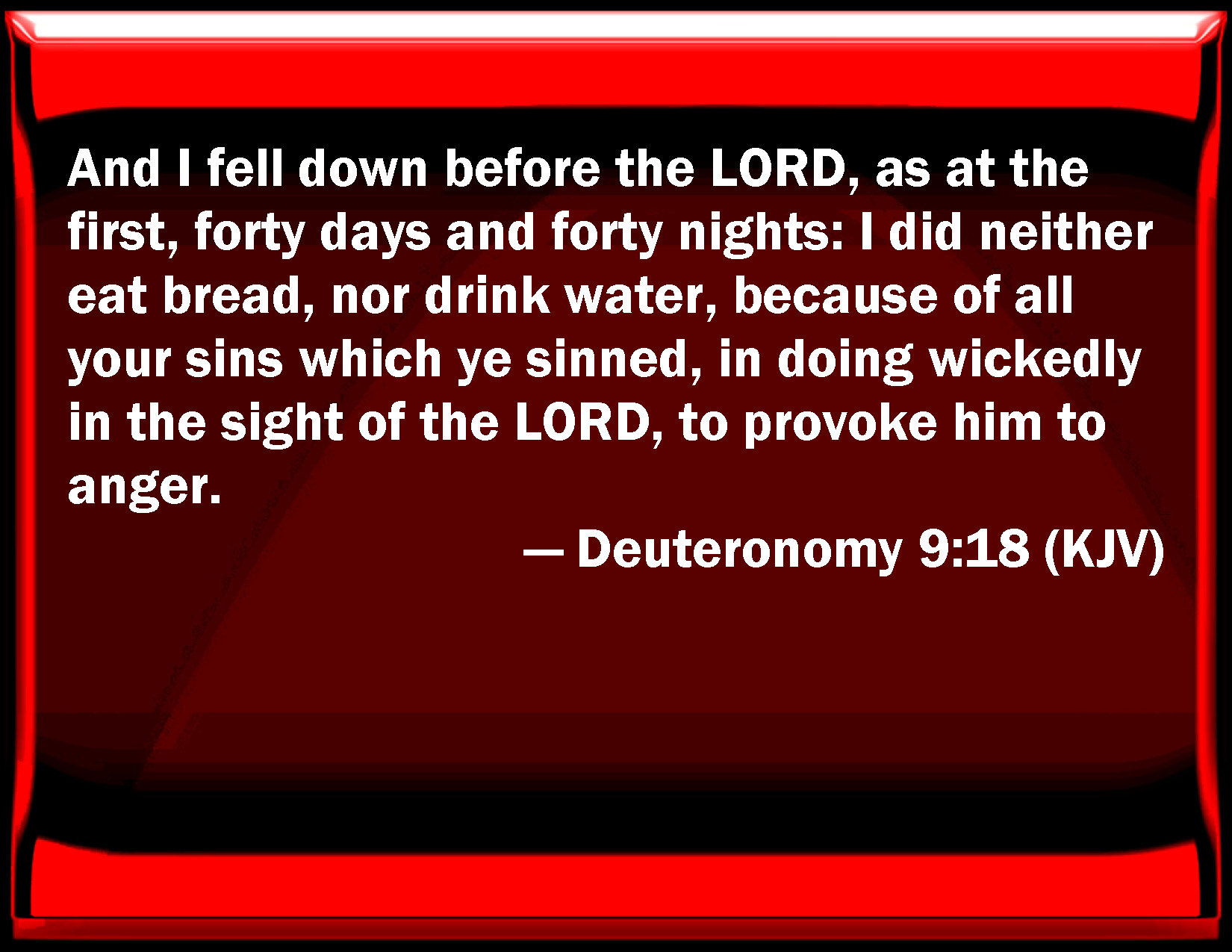Bible Verse Slide Deuteronomy 9:18 And I fell down before the LORD, as at the first, forty days and forty nights: I did neither eat bread, nor drink water, because of all your sins which you sinned, in doing wickedly in the sight of the LORD, to provoke him to anger. KJV: And I fell down before the LORD, as at the first, forty days and forty nights: I did neither eat bread, nor drink water, because of all your sins which ye sinned, in doing wickedly in the sight of the LORD, to provoke him to anger. DRB: And I fell down before the Lord se before, forty days and nights neither eating bread, nor drinking water, for all your sins, which you had committed against the Lord, and had provoked him to wrath: DBT: And I fell down before Jehovah, as at the first, forty days and forty nights, I ate no bread and drank no water, because of all your sin which ye had sinned, in doing what is evil in the eyes of Jehovah, to provoke him to anger. ERV: And I fell down before the LORD, as at the first, forty days and forty nights; I did neither eat bread nor drink water; because of all your sin which ye sinned, in doing that which was evil in the sight of the LORD, to provoke him to anger. WBT: And I fell down before the LORD, as at the first, forty days and forty nights: I neither ate bread, nor drank water, because of all your sins which ye sinned, in doing wickedly in the sight of the LORD, to provoke him to anger. WEB: I fell down before Yahweh, as at the first, forty days and forty nights; I did neither eat bread nor drink water; because of all your sin which you sinned, in doing that which was evil in the sight of Yahweh, to provoke him to anger. YLT: and I throw myself before Jehovah, as at first, forty days and forty nights; bread I have not eaten, and water I have not drunk, because of all your sins which ye have sinned, by doing the evil thing in the eyes of Jehovah, to make Him angry.Links Deuteronomy 9:18 NIV • Deuteronomy 9:18 NLT • Deuteronomy 9:18 ESV • Deuteronomy 9:18 NASB • Deuteronomy 9:18 KJV • Deuteronomy 9:18 Interlinear • Deuteronomy 9:18 Commentaries • Deuteronomy 9:18 Parallel Texts • Deuteronomy 9:18 Bible Apps • Deuteronomy 9:18 Parallel • Bible Hub |