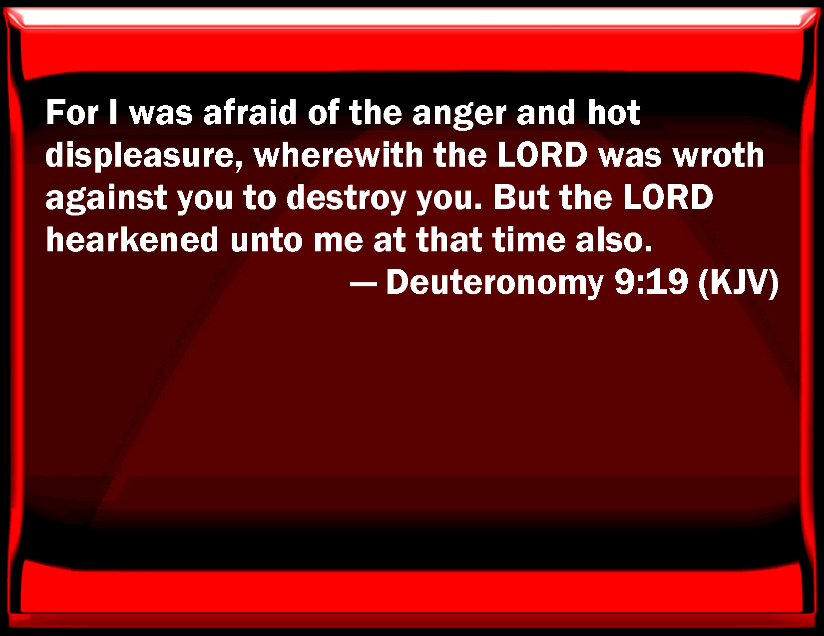 Deuteronomy 9:19 For I was afraid of the anger and hot displeasure, with which the LORD was wroth against you to destroy you. But the LORD listened to me at that time also.