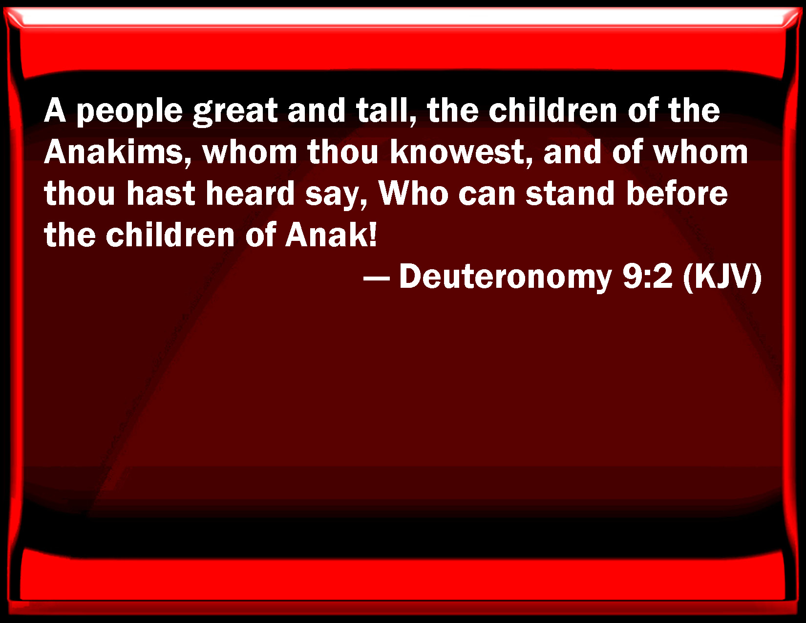 Bible Verse Slide Deuteronomy 9:2 A people great and tall, the children of the Anakims, whom you know, and of whom you have heard say, Who can stand before the children of Anak! KJV: A people great and tall, the children of the Anakims, whom thou knowest, and of whom thou hast heard say, Who can stand before the children of Anak! DRB: A People great and tall, the sons of the Enacims, whom thou hast seen, and heard of, against whom no man is able to stand. DBT: a people great and tall, the sons of the Anakim, whom thou knowest, and of whom thou hast heard say, Who can stand before the sons of Anak! ERV: a people great and tall, the sons of the Anakim, whom thou knowest, and of whom thou hast heard say, Who can stand before the sons of Anak? WBT: A people great and tall, the children of the Anakims, whom thou knowest, and of whom thou hast heard it said, Who can stand before the children of Anak! WEB: a people great and tall, the sons of the Anakim, whom you know, and of whom you have heard say, "Who can stand before the sons of Anak?" YLT: a people great and tall, sons of Anakim, whom thou — thou hast known, (and thou — thou hast heard: Who doth station himself before sons of Anak?)Links Deuteronomy 9:2 NIV • Deuteronomy 9:2 NLT • Deuteronomy 9:2 ESV • Deuteronomy 9:2 NASB • Deuteronomy 9:2 KJV • Deuteronomy 9:2 Interlinear • Deuteronomy 9:2 Commentaries • Deuteronomy 9:2 Parallel Texts • Deuteronomy 9:2 Bible Apps • Deuteronomy 9:2 Parallel • Bible Hub |