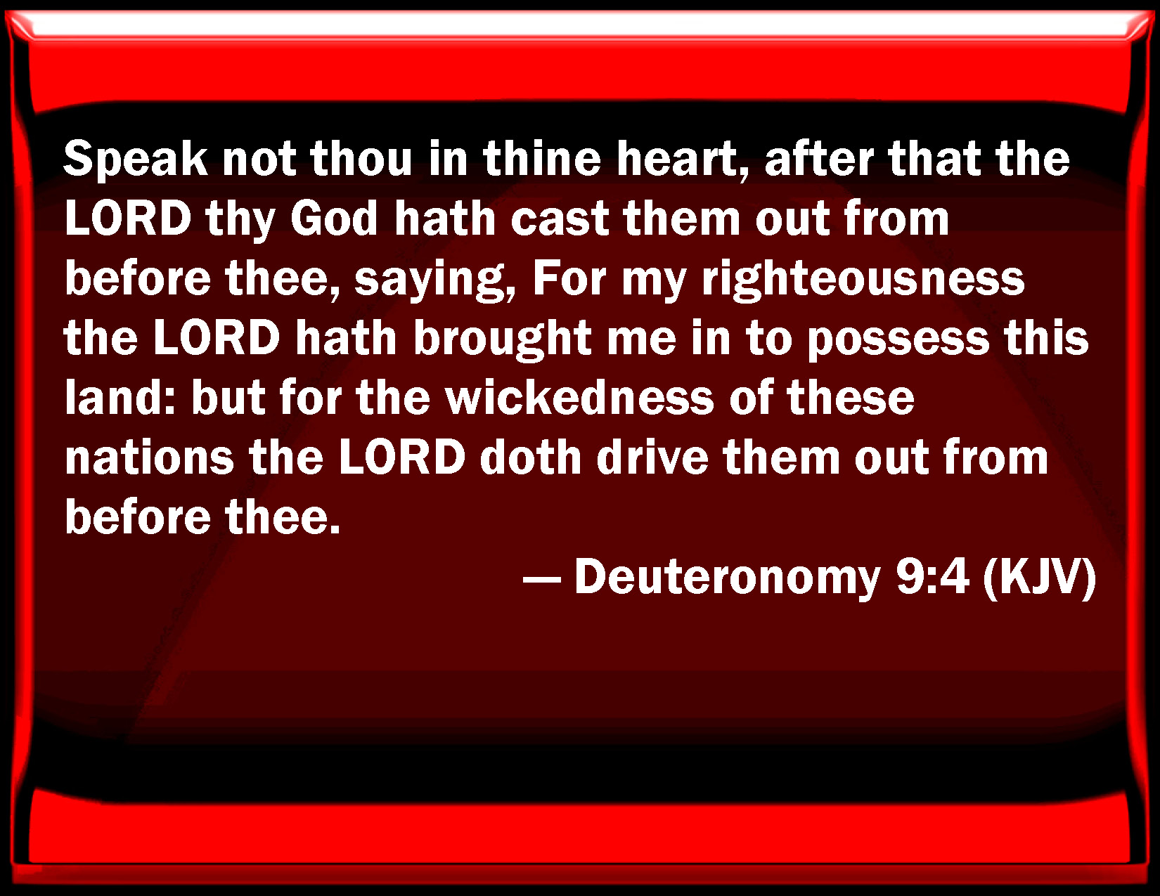 Bible Verse Slide Deuteronomy 9:4 Speak not you in your heart, after that the LORD your God has cast them out from before you, saying, For my righteousness the LORD has brought me in to possess this land: but for the wickedness of these nations the LORD does drive them out from before you. KJV: Speak not thou in thine heart, after that the LORD thy God hath cast them out from before thee, saying, For my righteousness the LORD hath brought me in to possess this land: but for the wickedness of these nations the LORD doth drive them out from before thee. DRB: Say not in thy heart, when the Lord thy God shall have destroyed them in thy sight: For my justice hath the Lord brought me in to possess this land, whereas these nations are destroyed for their wickedness. DBT: Thou shalt not say in thy heart, when Jehovah thy God thrusteth them out from before thee, saying, For my righteousness Jehovah hath brought me in to possess this land; but for the wickedness of these nations doth Jehovah dispossess them from before thee. ERV: Speak not thou in thine heart, after that the LORD thy God hath thrust them out from before thee, saying, For my righteousness the LORD hath brought me in to possess this land: whereas for the wickedness of these nations the LORD doth drive them out from before thee. WBT: Speak not thou in thy heart, after that the LORD thy God hath cast them out from before thee, saying, For my righteousness the LORD hath brought me in to possess this land: but for the wickedness of these nations the LORD doth drive them out from before thee. WEB: Don't say in your heart, after Yahweh your God has thrust them out from before you, saying, "For my righteousness Yahweh has brought me in to possess this land;" because Yahweh drives them out before you because of the wickedness of these nations. YLT: 'Thou dost not speak in thy heart (in Jehovah thy God's driving them away from before thee), saying, For my righteousness hath Jehovah brought me in to possess this land, seeing for the wickedness of these nations is Jehovah dispossessing them from thy presence;Links Deuteronomy 9:4 NIV • Deuteronomy 9:4 NLT • Deuteronomy 9:4 ESV • Deuteronomy 9:4 NASB • Deuteronomy 9:4 KJV • Deuteronomy 9:4 Interlinear • Deuteronomy 9:4 Commentaries • Deuteronomy 9:4 Parallel Texts • Deuteronomy 9:4 Bible Apps • Deuteronomy 9:4 Parallel • Bible Hub |
