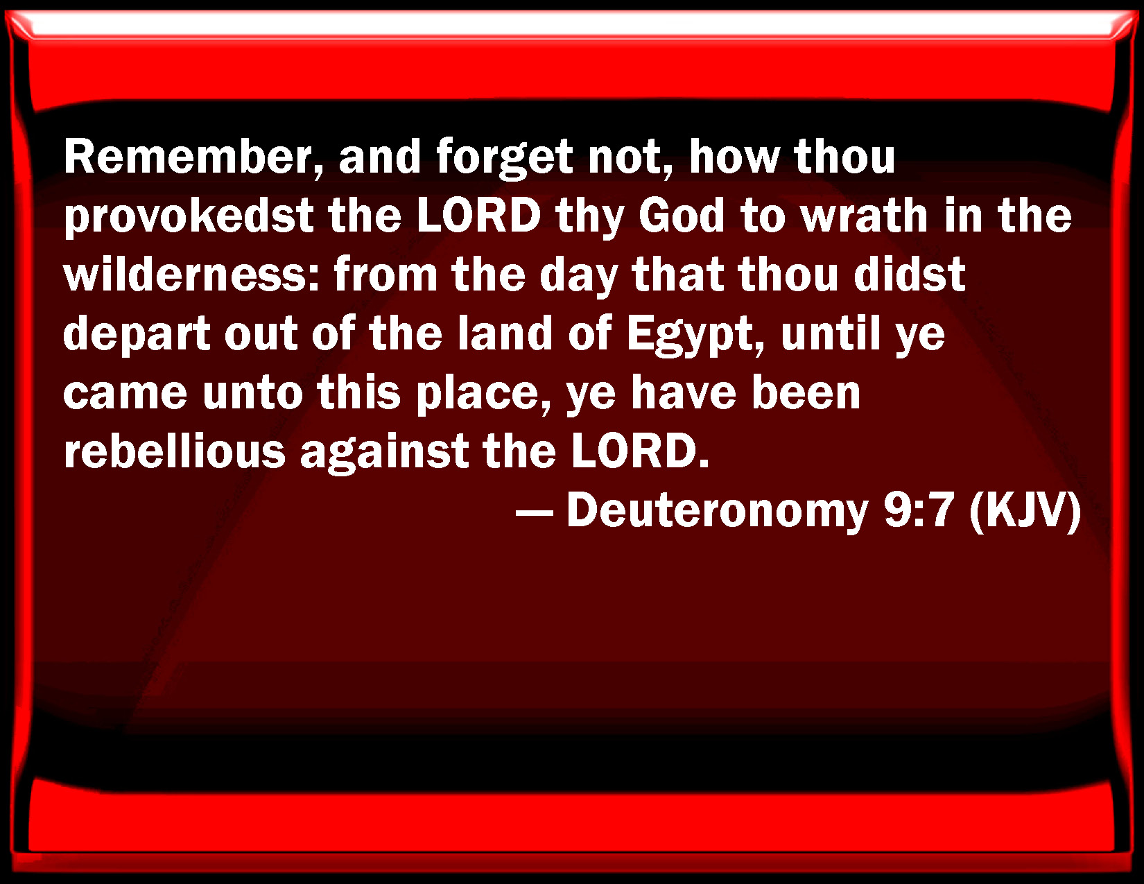 Bible Verse Slide Deuteronomy 9:7 Remember, and forget not, how you provoked the LORD your God to wrath in the wilderness: from the day that you did depart out of the land of Egypt, until you came to this place, you have been rebellious against the LORD. KJV: Remember, and forget not, how thou provokedst the LORD thy God to wrath in the wilderness: from the day that thou didst depart out of the land of Egypt, until ye came unto this place, ye have been rebellious against the LORD. DRB: Remember, and forget not how then provokedst the Lord thy God to wrath in the wilderness. From the day that thou camest out of Egypt unto this place, thou hast always strove against the Lord. DBT: Remember, forget not, how thou provokedst Jehovah thy God to wrath in the wilderness. From the day that thou didst depart out of the land of Egypt, until ye came to this place, ye have been rebellious against Jehovah. ERV: Remember, forget thou not, how thou provokedst the LORD thy God to wrath in the wilderness: from the day that thou wentest forth out of the land of Egypt, until ye came unto this place, ye have been rebellious against the LORD. WBT: Remember, and forget not, how thou provokedst the LORD thy God to wrath in the wilderness: from the day that thou didst depart from the land of Egypt, until ye came to this place, ye have been rebellious against the LORD. WEB: Remember, don't forget, how you provoked Yahweh your God to wrath in the wilderness: from the day that you went forth out of the land of Egypt, until you came to this place, you have been rebellious against Yahweh. YLT: Remember — do not forget — that with which thou hast made Jehovah thy God wroth in the wilderness; even from the day that thou hast come out of the land of Egypt till your coming in unto this place rebels ye have been with Jehovah;Links Deuteronomy 9:7 NIV • Deuteronomy 9:7 NLT • Deuteronomy 9:7 ESV • Deuteronomy 9:7 NASB • Deuteronomy 9:7 KJV • Deuteronomy 9:7 Interlinear • Deuteronomy 9:7 Commentaries • Deuteronomy 9:7 Parallel Texts • Deuteronomy 9:7 Bible Apps • Deuteronomy 9:7 Parallel • Bible Hub |