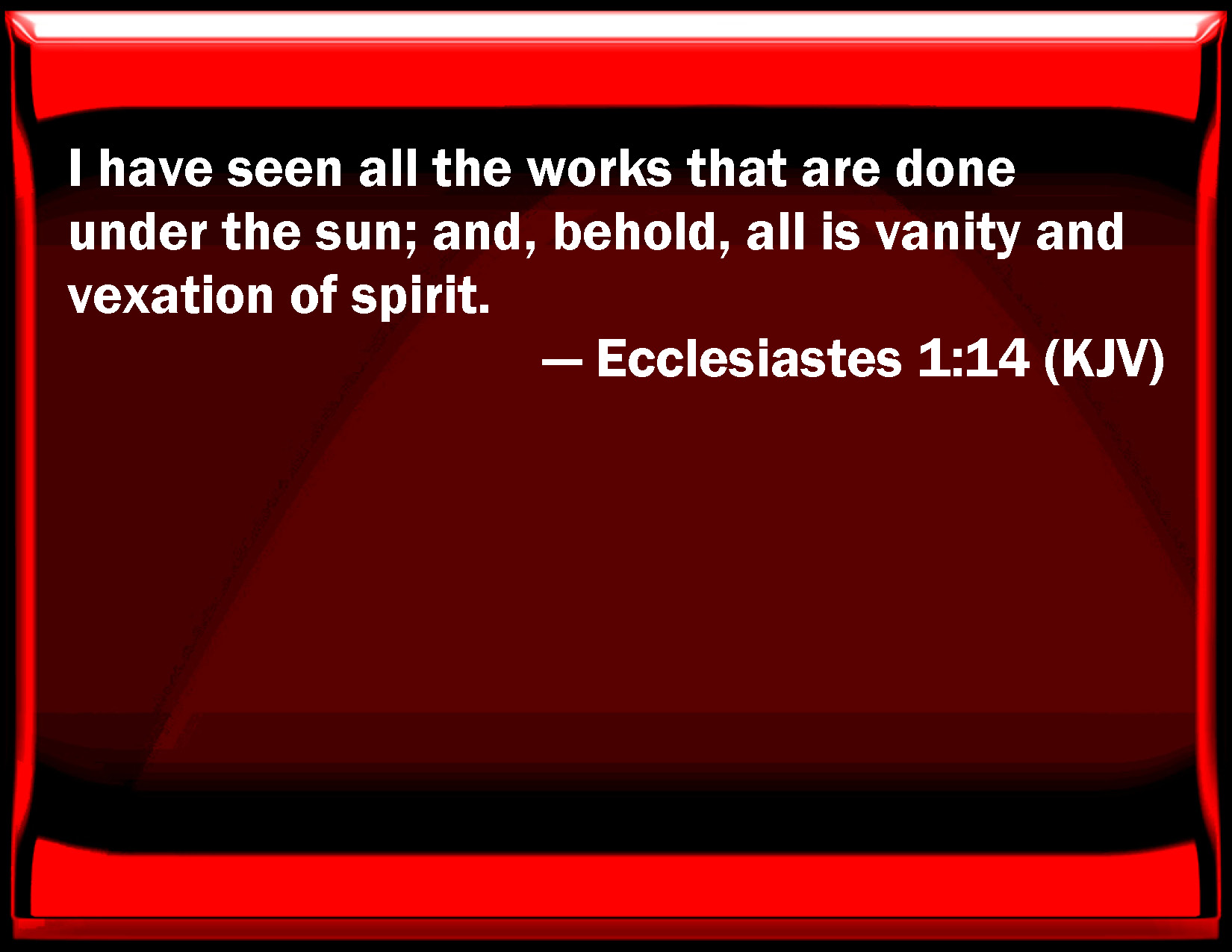 Bible Verse Slide Ecclesiastes 1:14 I have seen all the works that are done under the sun; and, behold, all is vanity and vexation of spirit. KJV: I have seen all the works that are done under the sun; and, behold, all is vanity and vexation of spirit. DRB: I have seen all things that are done under the sun, and behold all is vanity, and vexation of spirit. DBT: I have seen all the works that are done under the sun, and behold, all is vanity and pursuit of the wind. ERV: I have seen all the works that are done under the sun; and, behold, all is vanity and a striving after wind. WBT: I have seen all the works that are done under the sun; and behold, all is vanity and vexation of spirit. WEB: I have seen all the works that are done under the sun; and behold, all is vanity and a chasing after wind. YLT: I have seen all the works that have been done under the sun, and lo, the whole is vanity and vexation of spirit!Links Ecclesiastes 1:14 NIV • Ecclesiastes 1:14 NLT • Ecclesiastes 1:14 ESV • Ecclesiastes 1:14 NASB • Ecclesiastes 1:14 KJV • Ecclesiastes 1:14 Interlinear • Ecclesiastes 1:14 Commentaries • Ecclesiastes 1:14 Parallel Texts • Ecclesiastes 1:14 Bible Apps • Ecclesiastes 1:14 Parallel • Bible Hub |