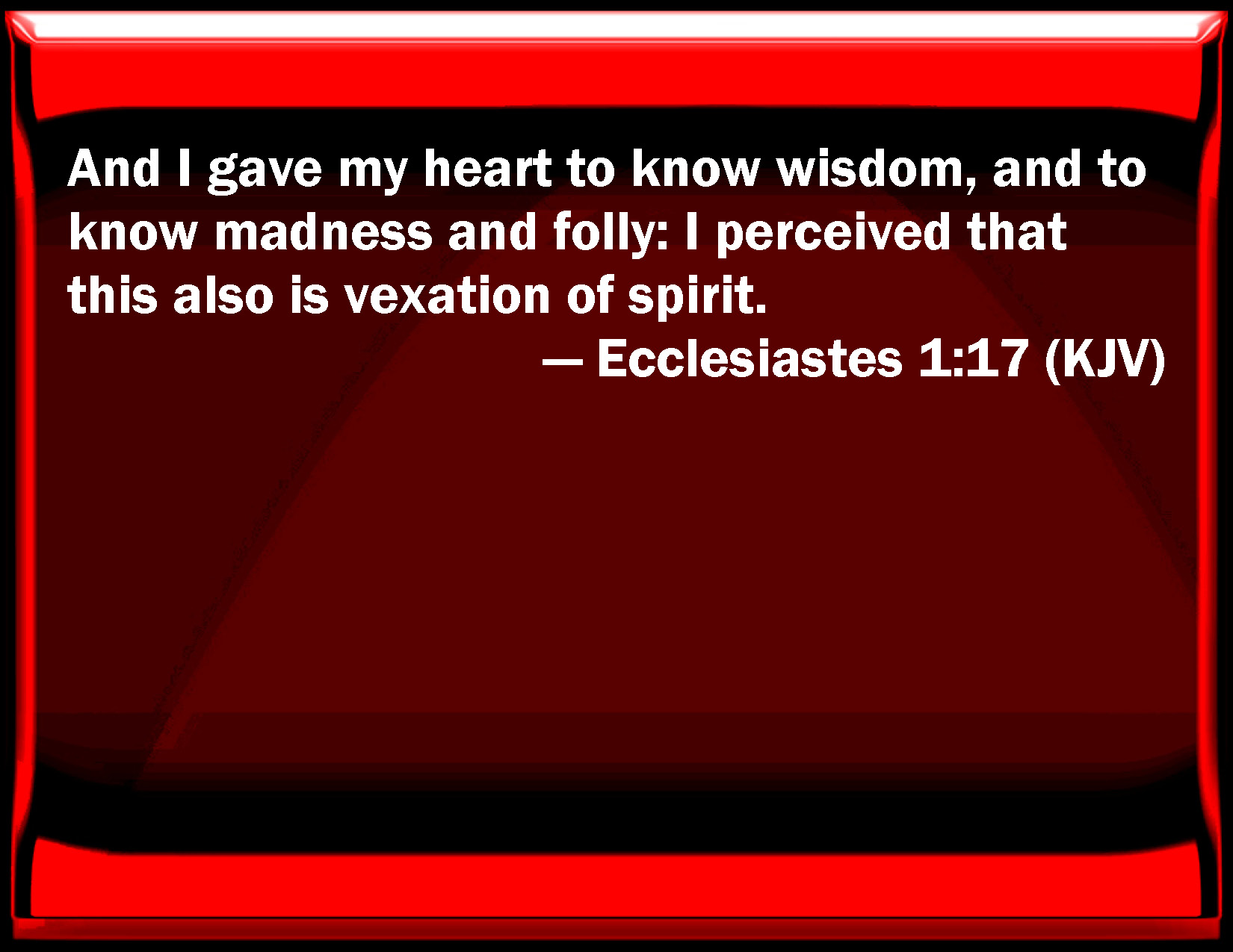 Bible Verse Slide Ecclesiastes 1:17 And I gave my heart to know wisdom, and to know madness and folly: I perceived that this also is vexation of spirit. KJV: And I gave my heart to know wisdom, and to know madness and folly: I perceived that this also is vexation of spirit. DRB: And I have given my heart to know prudence, and learning, and errors, and folly: and I have perceived that in these also there was labour, and vexation of spirit, DBT: And I applied my heart to the knowledge of wisdom, and to the knowledge of madness and folly: I perceived that this also is a striving after the wind. ERV: And I applied my heart to know wisdom, and to know madness and folly: I perceived that this also was a striving after wind. WBT: And I gave my heart to know wisdom, and to know madness and folly: I perceived that this also is vexation of spirit. WEB: I applied my heart to know wisdom, and to know madness and folly. I perceived that this also was a chasing after wind. YLT: And I give my heart to know wisdom, and to know madness and folly: I have known that even this is vexation of spirit;Links Ecclesiastes 1:17 NIV • Ecclesiastes 1:17 NLT • Ecclesiastes 1:17 ESV • Ecclesiastes 1:17 NASB • Ecclesiastes 1:17 KJV • Ecclesiastes 1:17 Interlinear • Ecclesiastes 1:17 Commentaries • Ecclesiastes 1:17 Parallel Texts • Ecclesiastes 1:17 Bible Apps • Ecclesiastes 1:17 Parallel • Bible Hub |