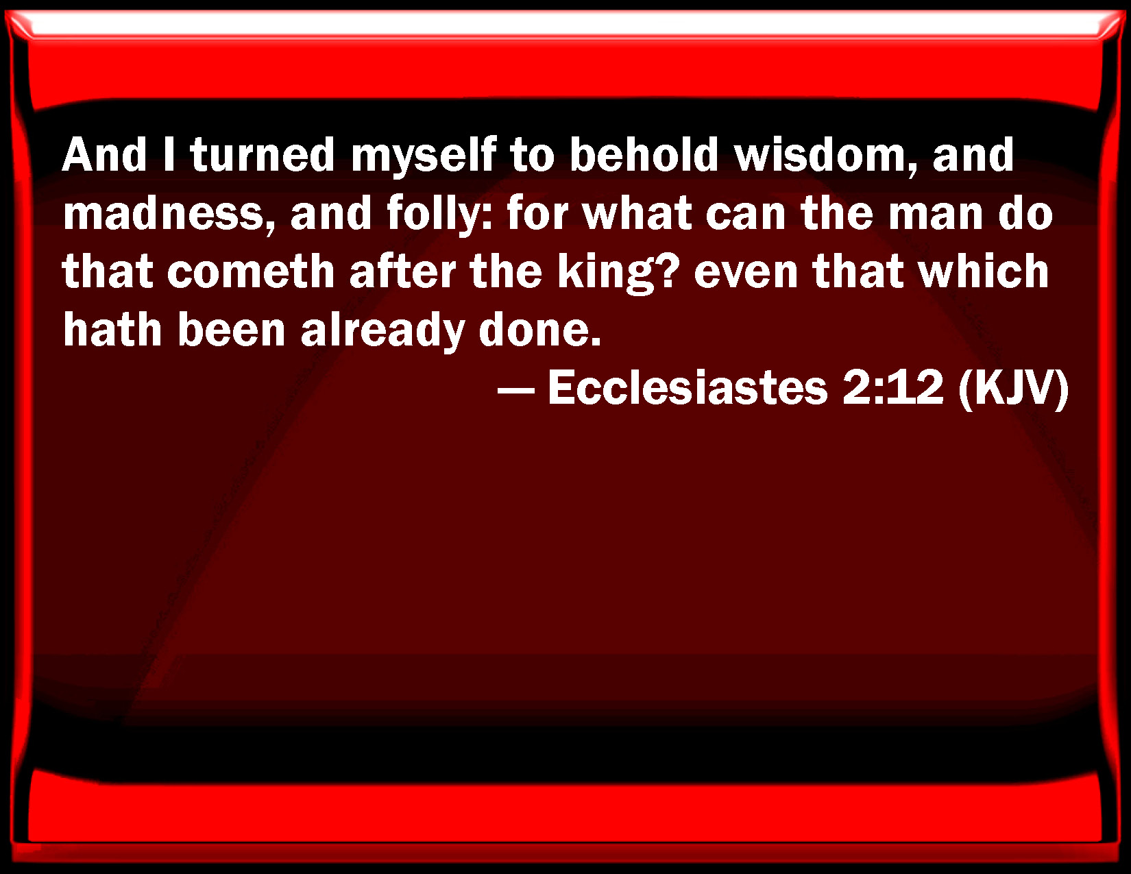 Bible Verse Slide Ecclesiastes 2:12 And I turned myself to behold wisdom, and madness, and folly: for what can the man do that comes after the king? even that which has been already done. KJV: And I turned myself to behold wisdom, and madness, and folly: for what can the man do that cometh after the king? even that which hath been already done. DRB: I passed further to behold wisdom, and errors and folly, (What is man, said I, that he can follow the King his maker?) DBT: And I turned myself to behold wisdom, and madness, and folly; for what shall the man do that cometh after the king? that which hath already been done. ERV: And I turned myself to behold wisdom, and madness and folly; for what can the man do that cometh after the king? even that which hath been already done. WBT: And I turned myself to behold wisdom, and madness, and folly: for what can the man do that cometh after the king? even that which hath been already done. WEB: I turned myself to consider wisdom, madness, and folly: for what can the king's successor do? Just that which has been done long ago. YLT: And I turned to see wisdom, and madness, and folly, but what is the man who cometh after the king? that which is already — they have done it!Links Ecclesiastes 2:12 NIV • Ecclesiastes 2:12 NLT • Ecclesiastes 2:12 ESV • Ecclesiastes 2:12 NASB • Ecclesiastes 2:12 KJV • Ecclesiastes 2:12 Interlinear • Ecclesiastes 2:12 Commentaries • Ecclesiastes 2:12 Parallel Texts • Ecclesiastes 2:12 Bible Apps • Ecclesiastes 2:12 Parallel • Bible Hub |