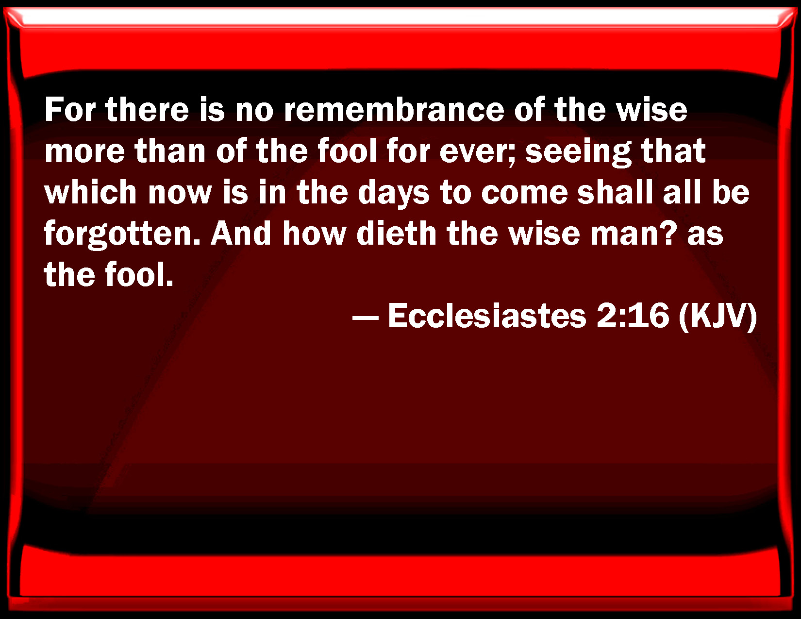 Bible Verse Slide Ecclesiastes 2:16 For there is no remembrance of the wise more than of the fool for ever; seeing that which now is in the days to come shall all be forgotten. And how dies the wise man? as the fool. KJV: For there is no remembrance of the wise more than of the fool for ever; seeing that which now is in the days to come shall all be forgotten. And how dieth the wise man? as the fool. DRB: For there shall be no remembrance of the wise no more than of the fool for ever, and the times to come shall cover all things together with oblivion: the learned dieth in like manner as the unlearned. DBT: For there shall be no remembrance of the wise more than of the fool for ever; because everything is already forgotten in the days which come. And how dieth the wise even as the fool? ERV: For of the wise man, even as of the fool, there is no remembrance for ever; seeing that in the days to come all will have been already forgotten. And how doth the wise man die even as the fool! WBT: For there is no remembrance of the wise more than of the fool for ever; seeing that which now is in the days to come shall all be forgotten. And how dieth the wise man? as the fool. WEB: For of the wise man, even as of the fool, there is no memory for ever, since in the days to come all will have been long forgotten. Indeed, the wise man must die just like the fool! YLT: That there is no remembrance to the wise — with the fool — to the age, for that which is already, in the days that are coming is all forgotten, and how dieth the wise? with the fool!Links Ecclesiastes 2:16 NIV • Ecclesiastes 2:16 NLT • Ecclesiastes 2:16 ESV • Ecclesiastes 2:16 NASB • Ecclesiastes 2:16 KJV • Ecclesiastes 2:16 Interlinear • Ecclesiastes 2:16 Commentaries • Ecclesiastes 2:16 Parallel Texts • Ecclesiastes 2:16 Bible Apps • Ecclesiastes 2:16 Parallel • Bible Hub |