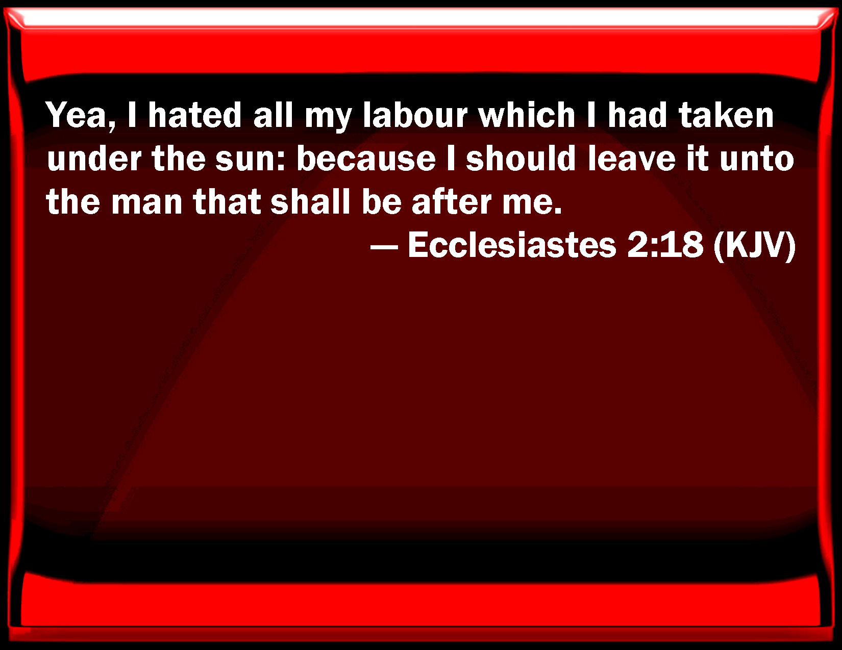 Ecclesiastes 2:18 Yes, I hated all my labor which I had taken under the sun: because I should leave it to the man that shall be after me.