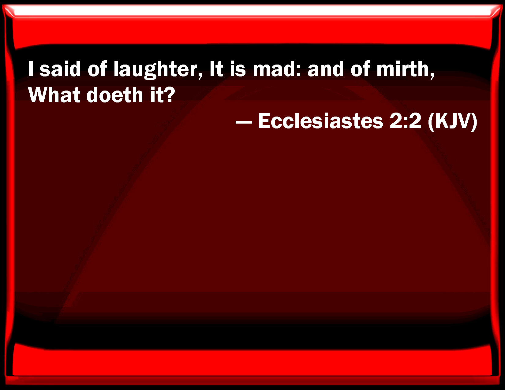 Bible Verse Slide Ecclesiastes 2:2 I said of laughter, It is mad: and of mirth, What does it? KJV: I said of laughter, It is mad: and of mirth, What doeth it? DRB: Laughter I counted error: and to mirth I said: Why art thou vainly deceived? DBT: I said of laughter, Madness! and of mirth, What availeth it? ERV: I said of laughter, It is mad: and of mirth, What doeth it? WBT: I said of laughter, It is mad: and of mirth, What doeth it? WEB: I said of laughter, "It is foolishness;" and of mirth, "What does it accomplish?" YLT: Of laughter I said, 'Foolish!' and of mirth, 'What is this it is doing?'Links Ecclesiastes 2:2 NIV • Ecclesiastes 2:2 NLT • Ecclesiastes 2:2 ESV • Ecclesiastes 2:2 NASB • Ecclesiastes 2:2 KJV • Ecclesiastes 2:2 Interlinear • Ecclesiastes 2:2 Commentaries • Ecclesiastes 2:2 Parallel Texts • Ecclesiastes 2:2 Bible Apps • Ecclesiastes 2:2 Parallel • Bible Hub |