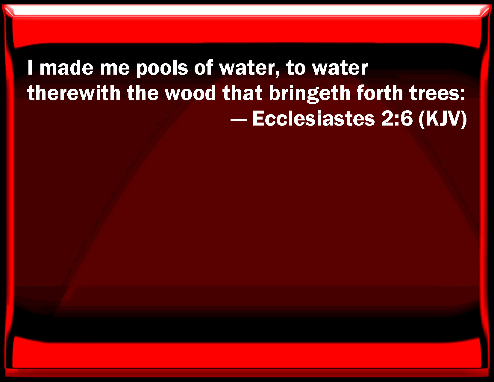 Bible Verse Slide Ecclesiastes 2:6 I made me pools of water, to water therewith the wood that brings forth trees: KJV: I made me pools of water, to water therewith the wood that bringeth forth trees: DRB: And I made me ponds of water, to water therewith the wood of the young trees, DBT: I made me ponds of water, to water therewith the wood, where the trees are reared. ERV: I made me pools of water, to water therefrom the forest where trees were reared: WBT: I made me pools of water, to water with them the wood that bringeth forth trees: WEB: I made myself pools of water, to water from it the forest where trees were reared. YLT: I made for me pools of water, to water from them a forest shooting forth trees.Links Ecclesiastes 2:6 NIV • Ecclesiastes 2:6 NLT • Ecclesiastes 2:6 ESV • Ecclesiastes 2:6 NASB • Ecclesiastes 2:6 KJV • Ecclesiastes 2:6 Interlinear • Ecclesiastes 2:6 Commentaries • Ecclesiastes 2:6 Parallel Texts • Ecclesiastes 2:6 Bible Apps • Ecclesiastes 2:6 Parallel • Bible Hub |