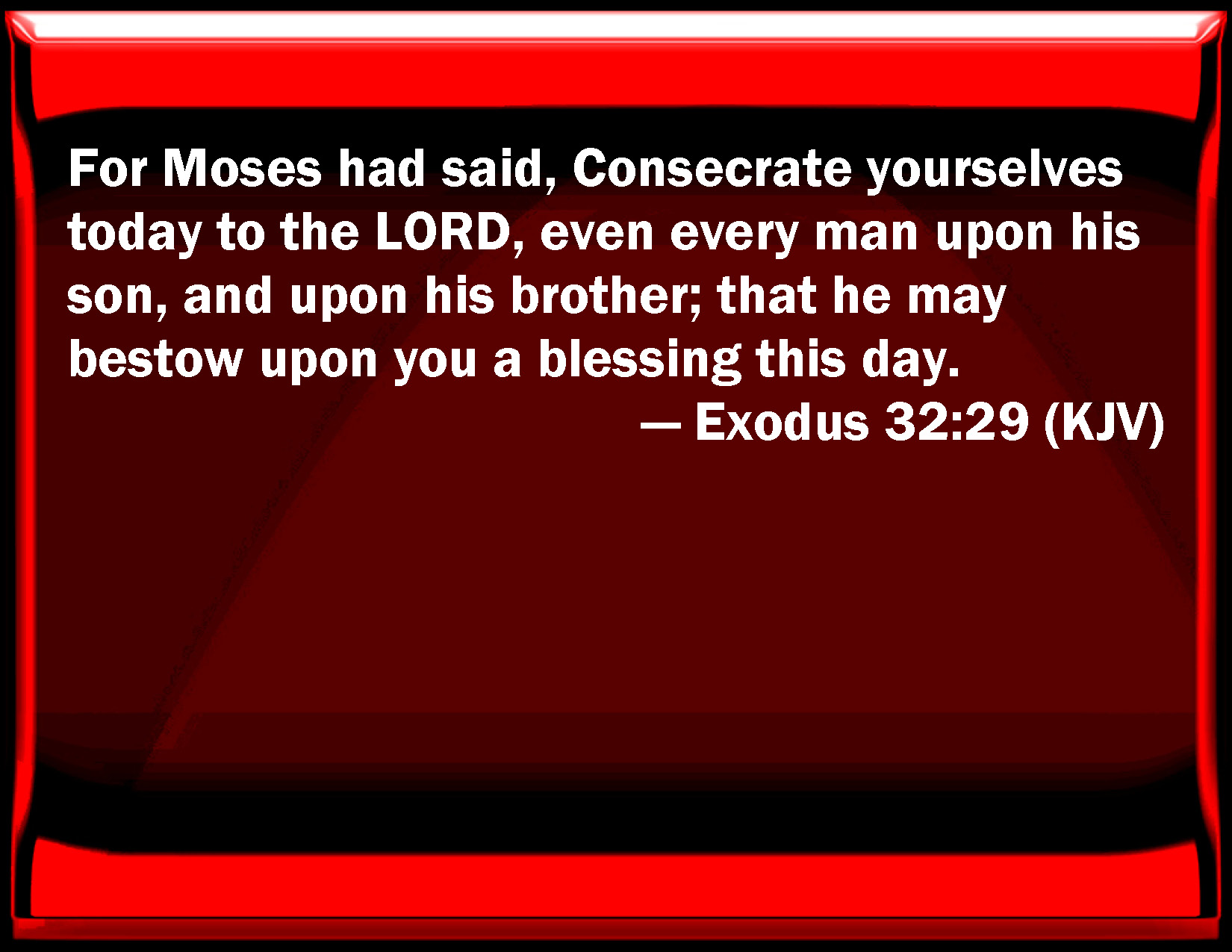 Bible Verse Slide Exodus 32:29 For Moses had said, Consecrate yourselves today to the LORD, even every man on his son, and on his brother; that he may bestow on you a blessing this day. KJV: For Moses had said, Consecrate yourselves to day to the LORD, even every man upon his son, and upon his brother; that he may bestow upon you a blessing this day. DRB: And Moses said: You have consecrated your hands this day to the Lord, every man in his son and in his brother, that a blessing may be given to you. DBT: And Moses said, Consecrate yourselves to-day to Jehovah, yea, every man with his son, and with his brother, and bring on yourselves a blessing to-day. ERV: And Moses said, Consecrate yourselves today to the LORD, yea, every man against his son, and against his brother; that he may bestow upon you a blessing this day. WBT: For Moses had said, Consecrate yourselves to-day to the LORD, even every man upon his son, and upon his brother; that he may bestow upon you a blessing this day. WEB: Moses said, "Consecrate yourselves today to Yahweh, yes, every man against his son, and against his brother; that he may bestow on you a blessing this day." YLT: and Moses saith, 'Consecrate your hand to-day to Jehovah, for a man is against his son, and against his brother, so as to bring on you to-day a blessing.'Links Exodus 32:29 NIV • Exodus 32:29 NLT • Exodus 32:29 ESV • Exodus 32:29 NASB • Exodus 32:29 KJV • Exodus 32:29 Interlinear • Exodus 32:29 Commentaries • Exodus 32:29 Parallel Texts • Exodus 32:29 Bible Apps • Exodus 32:29 Parallel • Bible Hub |