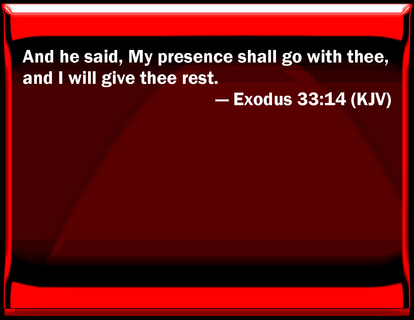 Bible Verse Slide Exodus 33:14 And he said, My presence shall go with you, and I will give you rest. KJV: And he said, My presence shall go with thee, and I will give thee rest. DRB: And the Lord said: My face shall go before thee, and I will give thee rest. DBT: And he said, My presence shall go, and I will give thee rest. ERV: And he said, My presence shall go with thee, and I will give thee rest. WBT: And he said, My presence shall attend thee, and I will give thee rest. WEB: He said, "My presence will go with you, and I will give you rest." YLT: and He saith, 'My presence doth go, and I have given rest to thee.'Links Exodus 33:14 NIV • Exodus 33:14 NLT • Exodus 33:14 ESV • Exodus 33:14 NASB • Exodus 33:14 KJV • Exodus 33:14 Interlinear • Exodus 33:14 Commentaries • Exodus 33:14 Parallel Texts • Exodus 33:14 Bible Apps • Exodus 33:14 Parallel • Bible Hub |