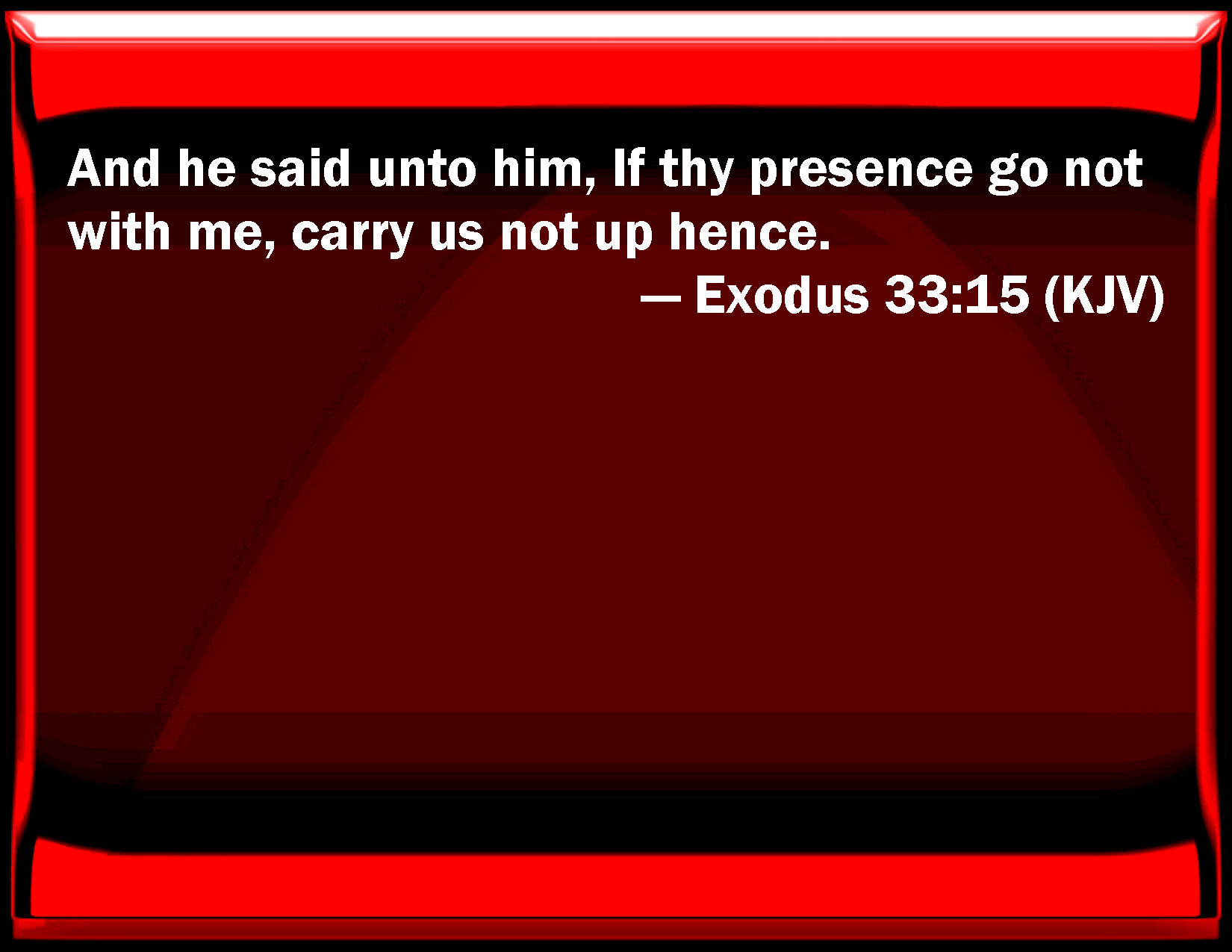 Bible Verse Slide Exodus 33:15 And he said to him, If your presence go not with me, carry us not up hence. KJV: And he said unto him, If thy presence go not with me, carry us not up hence. DRB: And Moses said: If thou thyself dost not go before, bring us not out of this place. DBT: And he said to him, If thy presence do not go, bring us not up hence. ERV: And he said unto him, If thy presence go not with me, carry us not up hence. WBT: And he said to him, If thy presence shall not attend me, conduct us not hence. WEB: He said to him, "If your presence doesn't go with me, don't carry us up from here. YLT: And he saith unto Him, 'If Thy presence is not going — take us not up from this place;Links Exodus 33:15 NIV • Exodus 33:15 NLT • Exodus 33:15 ESV • Exodus 33:15 NASB • Exodus 33:15 KJV • Exodus 33:15 Interlinear • Exodus 33:15 Commentaries • Exodus 33:15 Parallel Texts • Exodus 33:15 Bible Apps • Exodus 33:15 Parallel • Bible Hub |
