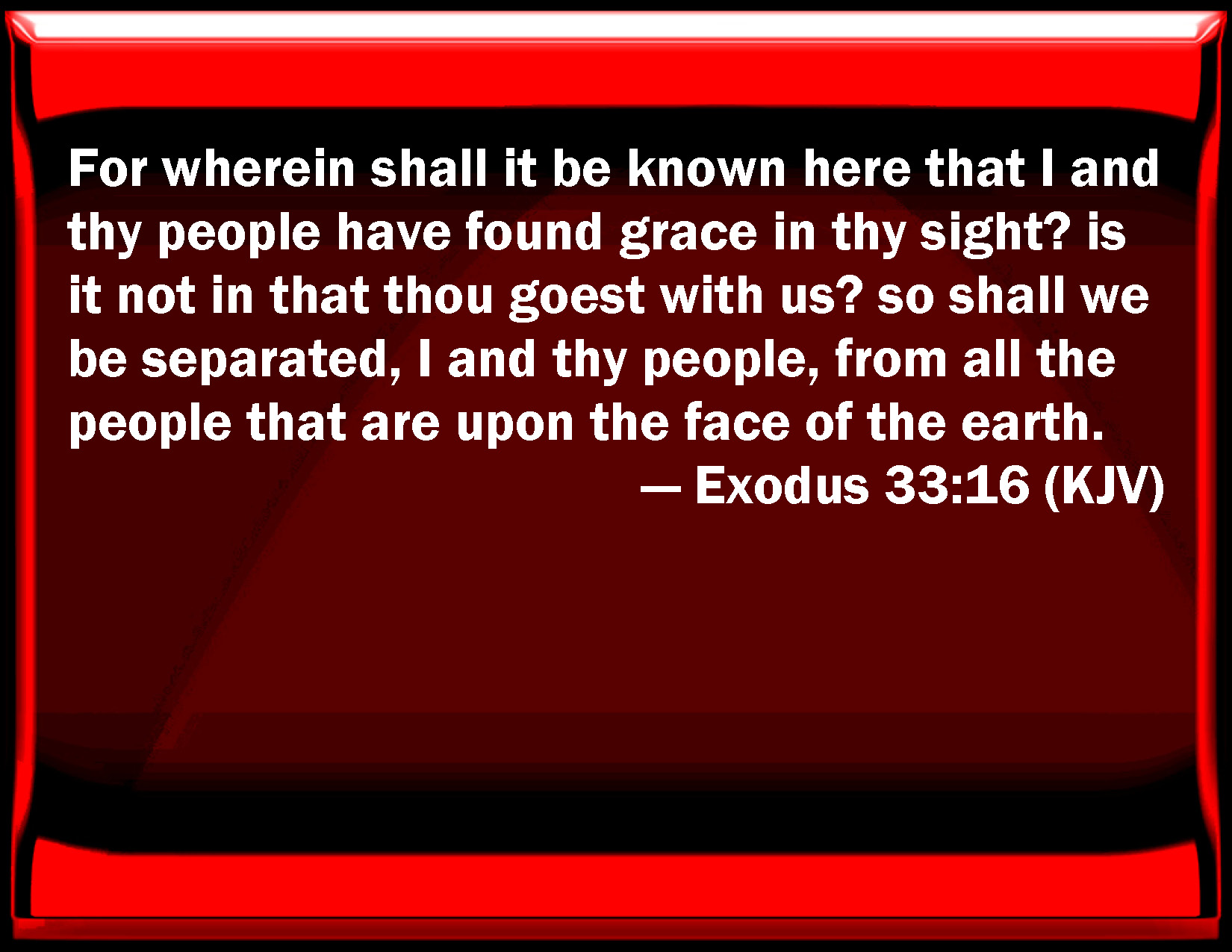Bible Verse Slide Exodus 33:16 For wherein shall it be known here that I and your people have found grace in your sight? is it not in that you go with us? so shall we be separated, I and your people, from all the people that are on the face of the earth. KJV: For wherein shall it be known here that I and thy people have found grace in thy sight? is it not in that thou goest with us? so shall we be separated, I and thy people, from all the people that are upon the face of the earth. DRB: For how shall we be able to know, I and thy people, that we have found grace in thy sight, unless thou walk with us, that we may be glorified by all people that dwell upon the earth? DBT: And how shall it be known then that I have found grace in thine eyes I and thy people? Is it not by thy going with us? so shall we be distinguished, I and thy people, from every people that is on the face of the earth. ERV: For wherein now shall it be known that I have found grace in thy sight, I and thy people? is it not in that thou goest with us, so that we be separated, I and thy people, from all the people that are upon the face of the earth? WBT: For wherein shall it be known here that I and thy people have found grace in thy sight? Is it not in that thou goest with us? So shall we be separated, I and thy people, from all the people that are upon the face of the earth. WEB: For how would people know that I have found favor in your sight, I and your people? Isn't it in that you go with us, so that we are separated, I and your people, from all the people who are on the surface of the earth?" YLT: and in what is it known now, that I have found grace in Thine eyes — I and Thy people — is it not in Thy going with us? and we have been distinguished — I and Thy people — from all the people who are on the face of the ground.'Links Exodus 33:16 NIV • Exodus 33:16 NLT • Exodus 33:16 ESV • Exodus 33:16 NASB • Exodus 33:16 KJV • Exodus 33:16 Interlinear • Exodus 33:16 Commentaries • Exodus 33:16 Parallel Texts • Exodus 33:16 Bible Apps • Exodus 33:16 Parallel • Bible Hub |