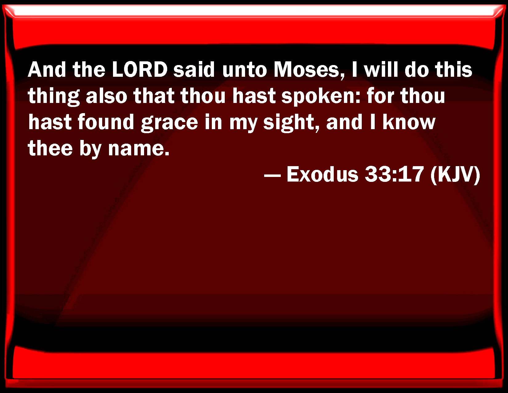 Bible Verse Slide Exodus 33:17 And the LORD said to Moses, I will do this thing also that you have spoken: for you have found grace in my sight, and I know you by name. KJV: And the LORD said unto Moses, I will do this thing also that thou hast spoken: for thou hast found grace in my sight, and I know thee by name. DRB: And the Lord said to Moses: This word also, which thou hast spoken, will I do: for thou hast found grace before me, and thee I have known by name. DBT: And Jehovah said to Moses, I will do this thing also that thou hast said; for thou hast found grace in mine eyes, and I know thee by name. ERV: And the LORD said unto Moses, I will do this thing also that thou hast spoken: for thou hast found grace in my sight, and I know thee by name. WBT: And the LORD said to Moses, I will do this thing also that thou hast spoken: for thou hast found grace in my sight, and I know thee by name. WEB: Yahweh said to Moses, "I will do this thing also that you have spoken; for you have found favor in my sight, and I know you by name." YLT: And Jehovah saith unto Moses, 'Even this thing which thou hast spoken I do; for thou hast found grace in Mine eyes, and I know thee by name.'Links Exodus 33:17 NIV • Exodus 33:17 NLT • Exodus 33:17 ESV • Exodus 33:17 NASB • Exodus 33:17 KJV • Exodus 33:17 Interlinear • Exodus 33:17 Commentaries • Exodus 33:17 Parallel Texts • Exodus 33:17 Bible Apps • Exodus 33:17 Parallel • Bible Hub |