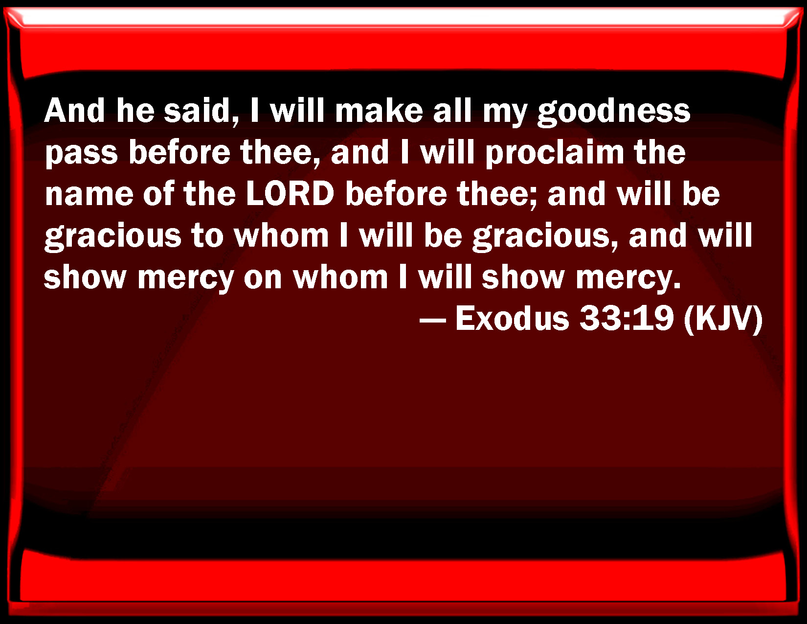 Bible Verse Slide Exodus 33:19 And he said, I will make all my goodness pass before you, and I will proclaim the name of the LORD before you; and will be gracious to whom I will be gracious, and will show mercy on whom I will show mercy. KJV: And he said, I will make all my goodness pass before thee, and I will proclaim the name of the LORD before thee; and will be gracious to whom I will be gracious, and will shew mercy on whom I will shew mercy. DRB: He answered: I will shew thee all good, and I will proclaim in the name of the Lord before thee: and I will have mercy on whom I will, and I will be merciful to whom it shall please me. DBT: And he said, I will make all my goodness pass before thy face, and I will proclaim the name of Jehovah before thee; and I will be gracious to whom I will be gracious, and I will shew mercy on whom I will shew mercy. ERV: And he said, I will make all my goodness pass before thee, and will proclaim the name of the LORD before thee; and I will be gracious to whom I will be gracious, and will shew mercy on whom I will shew mercy. WBT: And he said, I will make all my goodness pass before thee, and I will proclaim the name of the LORD before thee; and will be gracious to whom I will be gracious, and will show mercy on whom I will show mercy. WEB: He said, "I will make all my goodness pass before you, and will proclaim the name of Yahweh before you. I will be gracious to whom I will be gracious, and will show mercy on whom I will show mercy." YLT: and He saith, 'I cause all My goodness to pass before thy face, and have called concerning the Name of Jehovah before thee, and favoured him whom I favour, and loved him whom I love.'Links Exodus 33:19 NIV • Exodus 33:19 NLT • Exodus 33:19 ESV • Exodus 33:19 NASB • Exodus 33:19 KJV • Exodus 33:19 Interlinear • Exodus 33:19 Commentaries • Exodus 33:19 Parallel Texts • Exodus 33:19 Bible Apps • Exodus 33:19 Parallel • Bible Hub |
