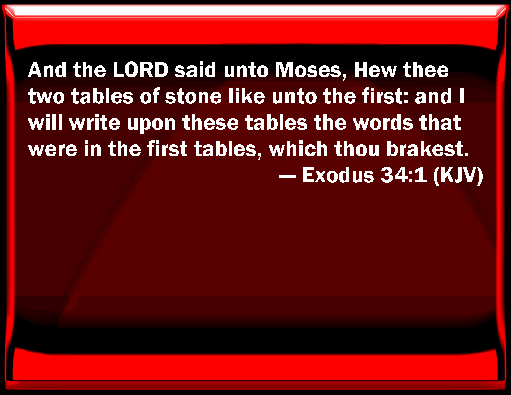 Bible Verse Slide Exodus 34:1 And the LORD said to Moses, Hew you two tables of stone like to the first: and I will write on these tables the words that were in the first tables, which you brake. KJV: And the LORD said unto Moses, Hew thee two tables of stone like unto the first: and I will write upon these tables the words that were in the first tables, which thou brakest. DRB: And after this he said: Hew thee two tables of stone like unto the former, and I will write upon them the words which were in the tables, which thou brokest. DBT: And Jehovah said to Moses, Hew for thyself two tables of stone like the first; and I will write upon the tables the words that were upon the first tables, which thou hast broken. ERV: And the LORD said unto Moses, Hew thee two tables of stone like unto the first: and I will write upon the tables the words that were on the first tables, which thou brakest. WBT: And the LORD said to Moses, Hew thee two tables of stone like the first; and I will write upon these tables the words that were in the first tables which thou didst break. WEB: Yahweh said to Moses, "Chisel two stone tablets like the first: and I will write on the tablets the words that were on the first tablets, which you broke. YLT: And Jehovah saith unto Moses, 'Hew for thyself two tables of stone like the first, and I have written on the tables the words which were on the first tables which thou hast broken;Links Exodus 34:1 NIV • Exodus 34:1 NLT • Exodus 34:1 ESV • Exodus 34:1 NASB • Exodus 34:1 KJV • Exodus 34:1 Interlinear • Exodus 34:1 Commentaries • Exodus 34:1 Parallel Texts • Exodus 34:1 Bible Apps • Exodus 34:1 Parallel • Bible Hub |