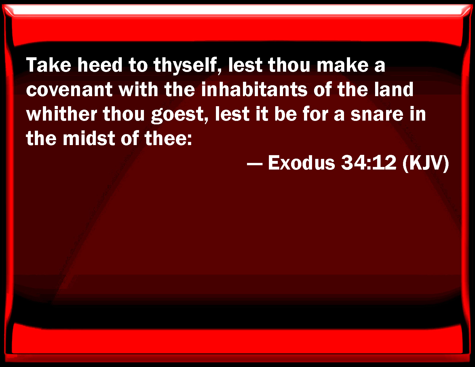 Bible Verse Slide Exodus 34:12 Take heed to yourself, lest you make a covenant with the inhabitants of the land where you go, lest it be for a snare in the middle of you: KJV: Take heed to thyself, lest thou make a covenant with the inhabitants of the land whither thou goest, lest it be for a snare in the midst of thee: DRB: Beware thou never join in friendship with the inhabitants of that land, which may be thy ruin: DBT: Take heed to thyself, that thou make no covenant with the inhabitants of the land to which thou shalt come, lest it be a snare in the midst of thee; ERV: Take heed to thyself, lest thou make a covenant with the inhabitants of the land whither thou goest, lest it be for a snare in the midst of thee: WBT: Take heed to thyself, lest thou make a covenant with the inhabitants of the land whither thou goest, lest it be for a snare in the midst of thee: WEB: Be careful, lest you make a covenant with the inhabitants of the land where you are going, lest it be for a snare in the midst of you: YLT: take heed to thyself, lest thou make a covenant with the inhabitant of the land into which thou art going, lest it become a snare in thy midst;Links Exodus 34:12 NIV • Exodus 34:12 NLT • Exodus 34:12 ESV • Exodus 34:12 NASB • Exodus 34:12 KJV • Exodus 34:12 Interlinear • Exodus 34:12 Commentaries • Exodus 34:12 Parallel Texts • Exodus 34:12 Bible Apps • Exodus 34:12 Parallel • Bible Hub |
