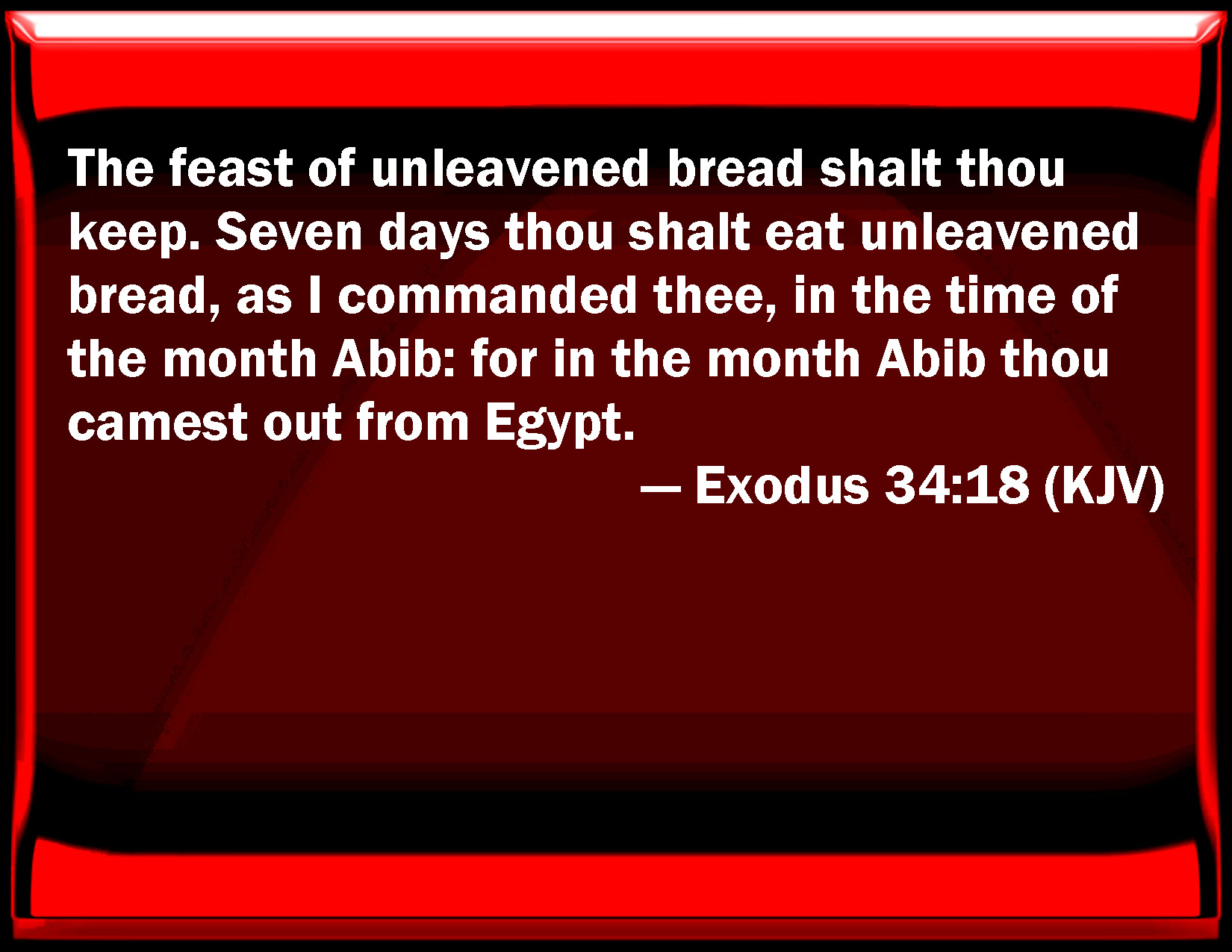Bible Verse Slide Exodus 34:18 The feast of unleavened bread shall you keep. Seven days you shall eat unleavened bread, as I commanded you, in the time of the month Abib: for in the month Abib you came out from Egypt. KJV: The feast of unleavened bread shalt thou keep. Seven days thou shalt eat unleavened bread, as I commanded thee, in the time of the month Abib: for in the month Abib thou camest out from Egypt. DRB: Thou shalt keep the feast of the unleavened bread. Seven days shalt thou eat unleavened bread, as I commanded thee in the time of the month of the new corn: for in the month of the springtime thou camest out from Egypt. DBT: The feast of the unleavened bread shalt thou keep: seven days shalt thou eat unleavened bread, as I have commanded thee, at the appointed time of the month Abib; for in the month Abib thou camest out from Egypt. ERV: The feast of unleavened bread shalt thou keep. Seven days thou shalt eat unleavened bread, as I commanded thee, at the time appointed in the month Abib: for in the month Abib thou camest out from Egypt. WBT: The feast of unleavened bread shalt thou keep. Seven days shalt thou eat unleavened bread, as I commanded thee, in the time of the month Abib: for in the month Abib thou camest out of from Egypt. WEB: "You shall keep the feast of unleavened bread. Seven days you shall eat unleavened bread, as I commanded you, at the time appointed in the month Abib; for in the month Abib you came out from Egypt. YLT: 'The feast of unleavened things thou dost keep; seven days thou dost eat unleavened things, as I have commanded thee, at an appointed time, the month of Abib: for in the month of Abib thou didst come out from Egypt.Links Exodus 34:18 NIV • Exodus 34:18 NLT • Exodus 34:18 ESV • Exodus 34:18 NASB • Exodus 34:18 KJV • Exodus 34:18 Interlinear • Exodus 34:18 Commentaries • Exodus 34:18 Parallel Texts • Exodus 34:18 Bible Apps • Exodus 34:18 Parallel • Bible Hub |