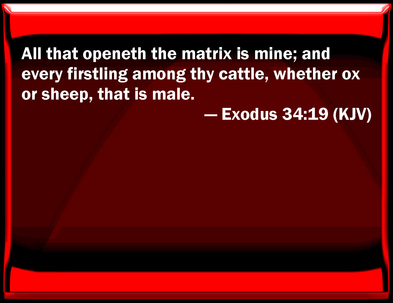 Bible Verse Slide Exodus 34:19 All that opens the matrix is mine; and every firstling among your cattle, whether ox or sheep, that is male. KJV: All that openeth the matrix is mine; and every firstling among thy cattle, whether ox or sheep, that is male. DRB: All of the male kind, that openeth the womb, shall be mine. Of all beasts, both of oxen and of sheep, it shall be mine. DBT: All that openeth the womb is mine; and all the cattle that is born a male, the firstling of ox and sheep. ERV: All that openeth the womb is mine; and all thy cattle that is male, the firstlings of ox and sheep. WBT: Every first-born is mine: and every firstling among thy cattle, whether ox or sheep, that is male. WEB: "All that opens the womb is mine; and all your livestock that is male, the firstborn of cow and sheep. YLT: All opening a womb are Mine, and every firstling of thy cattle born a male, ox or sheep;Links Exodus 34:19 NIV • Exodus 34:19 NLT • Exodus 34:19 ESV • Exodus 34:19 NASB • Exodus 34:19 KJV • Exodus 34:19 Interlinear • Exodus 34:19 Commentaries • Exodus 34:19 Parallel Texts • Exodus 34:19 Bible Apps • Exodus 34:19 Parallel • Bible Hub |