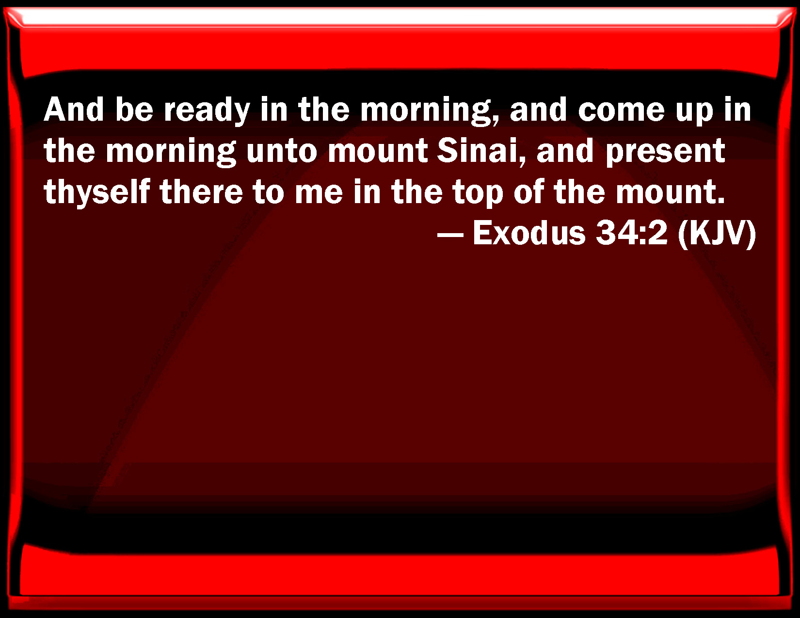 Bible Verse Slide Exodus 34:2 And be ready in the morning, and come up in the morning to mount Sinai, and present yourself there to me in the top of the mount. KJV: And be ready in the morning, and come up in the morning unto mount Sinai, and present thyself there to me in the top of the mount. DRB: Be ready in the morning, that thou mayst forthwith go up into mount Sinai, and thou shalt stand with me upon the top of the mount. DBT: And be ready for the morning, and go up in the morning to mount Sinai, and stand there before me on the top of the mountain. ERV: And be ready by the morning, and come up in the morning unto mount Sinai, and present thyself there to me on the top of the mount. WBT: And be ready in the morning, and come up in the morning to mount Sinai, and present thyself there to me on the top of the mount. WEB: Be ready by the morning, and come up in the morning to Mount Sinai, and present yourself there to me on the top of the mountain. YLT: and be prepared at morning, and thou hast come up in the morning unto mount Sinai, and hast stood before Me there, on the top of the mount,Links Exodus 34:2 NIV • Exodus 34:2 NLT • Exodus 34:2 ESV • Exodus 34:2 NASB • Exodus 34:2 KJV • Exodus 34:2 Interlinear • Exodus 34:2 Commentaries • Exodus 34:2 Parallel Texts • Exodus 34:2 Bible Apps • Exodus 34:2 Parallel • Bible Hub |