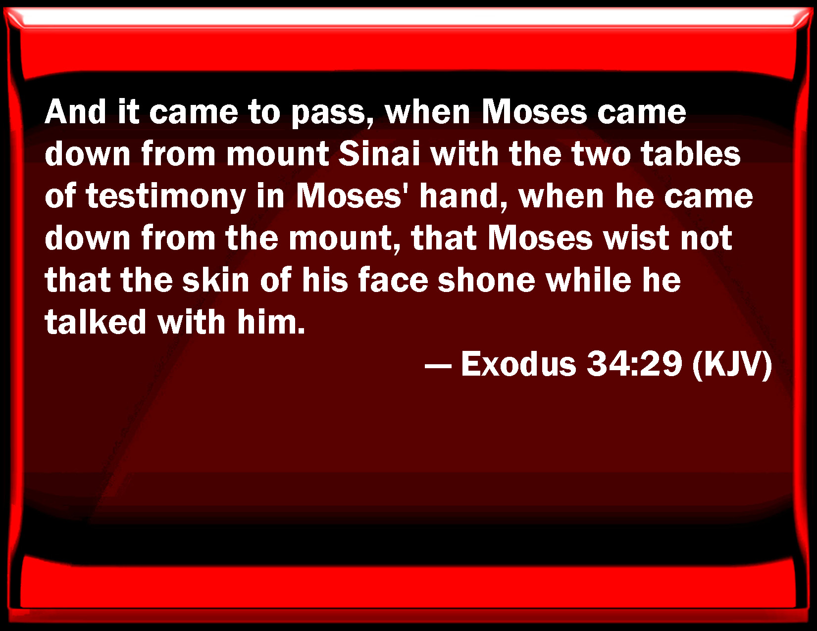 Bible Verse Slide Exodus 34:29 And it came to pass, when Moses came down from mount Sinai with the two tables of testimony in Moses' hand, when he came down from the mount, that Moses knew not that the skin of his face shone while he talked with him. KJV: And it came to pass, when Moses came down from mount Sinai with the two tables of testimony in Moses' hand, when he came down from the mount, that Moses wist not that the skin of his face shone while he talked with him. DRB: And when Moses came down from the mount Sinai, he held the two tables of the testimony, and he knew not that his face was horned from the conversation of the Lord. DBT: And it came to pass, when Moses came down from mount Sinai and the two tables of testimony were in Moses' hand, when he came down from the mountain that Moses knew not that the skin of his face shone through his talking with him. ERV: And it came to pass, when Moses came down from mount Sinai with the two tables of the testimony in Moses' hand, when he came down from the mount, that Moses wist not that the skin of his face shone by reason of his speaking with him. WBT: And it came to pass when Moses came down from mount Sinai (with the two tables of testimony in Moses's hand, when he came down from the mount) that Moses knew not that the skin of his face shone, while he talked with him. WEB: It happened, when Moses came down from Mount Sinai with the two tablets of the testimony in Moses' hand, when he came down from the mountain, that Moses didn't know that the skin of his face shone by reason of his speaking with him. YLT: And it cometh to pass, when Moses is coming down from mount Sinai (and the two tables of the testimony are in the hand of Moses in his coming down from the mount), that Moses hath not known that the skin of his face hath shone in His speaking with him,Links Exodus 34:29 NIV • Exodus 34:29 NLT • Exodus 34:29 ESV • Exodus 34:29 NASB • Exodus 34:29 KJV • Exodus 34:29 Interlinear • Exodus 34:29 Commentaries • Exodus 34:29 Parallel Texts • Exodus 34:29 Bible Apps • Exodus 34:29 Parallel • Bible Hub |