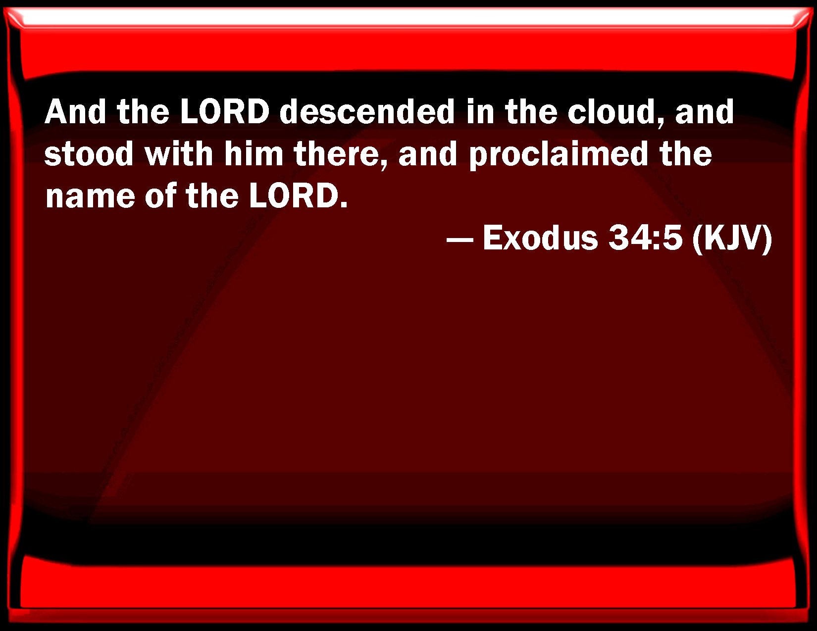 Bible Verse Slide Exodus 34:5 And the LORD descended in the cloud, and stood with him there, and proclaimed the name of the LORD. KJV: And the LORD descended in the cloud, and stood with him there, and proclaimed the name of the LORD. DRB: And when the Lord was come down in a cloud, Moses stood with him, calling upon the name of the Lord. DBT: And Jehovah came down in the cloud, and stood beside him there, and proclaimed the name of Jehovah. ERV: And the LORD descended in the cloud, and stood with him there, and proclaimed the name of the LORD. WBT: And the LORD descended in the cloud, and stood with him there, and proclaimed the name of the LORD. WEB: Yahweh descended in the cloud, and stood with him there, and proclaimed the name of Yahweh. YLT: And Jehovah cometh down in a cloud, and stationeth Himself with him there, and calleth in the Name of Jehovah,Links Exodus 34:5 NIV • Exodus 34:5 NLT • Exodus 34:5 ESV • Exodus 34:5 NASB • Exodus 34:5 KJV • Exodus 34:5 Interlinear • Exodus 34:5 Commentaries • Exodus 34:5 Parallel Texts • Exodus 34:5 Bible Apps • Exodus 34:5 Parallel • Bible Hub |