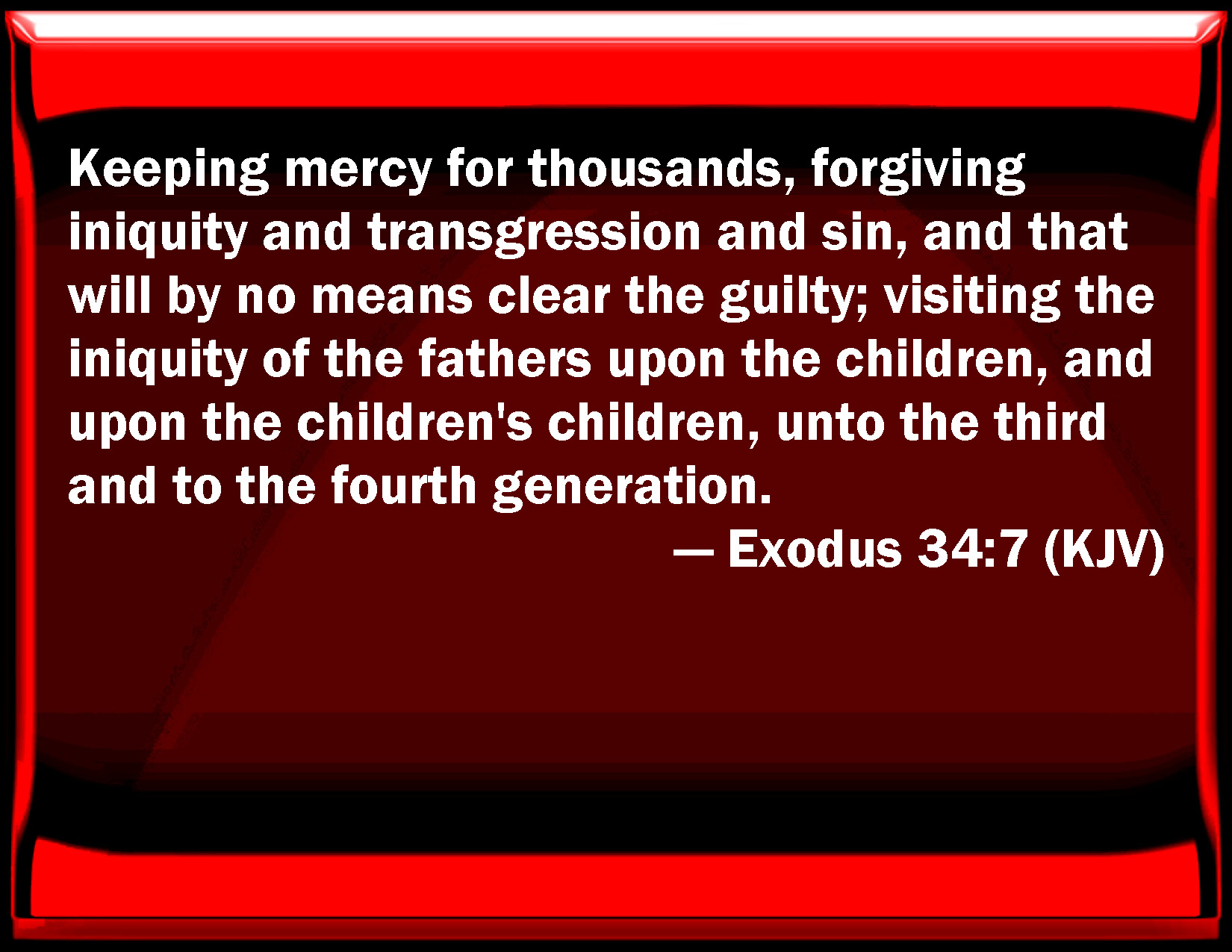 Bible Verse Slide Exodus 34:7 Keeping mercy for thousands, forgiving iniquity and transgression and sin, and that will by no means clear the guilty; visiting the iniquity of the fathers on the children, and on the children's children, to the third and to the fourth generation. KJV: Keeping mercy for thousands, forgiving iniquity and transgression and sin, and that will by no means clear the guilty; visiting the iniquity of the fathers upon the children, and upon the children's children, unto the third and to the fourth generation. DRB: Who keepest mercy unto thousands: who takest away iniquity, and wickedness, and sin, and no man of himself is innocent before thee. Who renderest the iniquity of the fathers to the children, and to the grandchildren, unto the third and fourth generation. DBT: keeping mercy unto thousands, forgiving iniquity and transgression and sin, but by no means clearing the guilty; visiting the iniquity of the fathers upon the children, and upon the children's children, upon the third and upon the fourth generation. ERV: keeping mercy for thousands, forgiving iniquity and transgression and sin: and that will by no means clear the guilty; visiting the iniquity of the fathers upon the children, and upon the children's children, upon the third and upon the fourth generation. WBT: Keeping mercy for thousands, forgiving iniquity and transgression and sin, and that will by no means clear the guilty; visiting the iniquity of the fathers upon the children, and upon the children's children, to the third and to the fourth generation. WEB: keeping loving kindness for thousands, forgiving iniquity and disobedience and sin; and that will by no means clear the guilty, visiting the iniquity of the fathers on the children, and on the children's children, on the third and on the fourth generation." YLT: keeping kindness for thousands, taking away iniquity, and transgression, and sin, and not entirely acquitting, charging iniquity of fathers on children, and on children's children, on a third generation, and on a fourth.'Links Exodus 34:7 NIV • Exodus 34:7 NLT • Exodus 34:7 ESV • Exodus 34:7 NASB • Exodus 34:7 KJV • Exodus 34:7 Interlinear • Exodus 34:7 Commentaries • Exodus 34:7 Parallel Texts • Exodus 34:7 Bible Apps • Exodus 34:7 Parallel • Bible Hub |