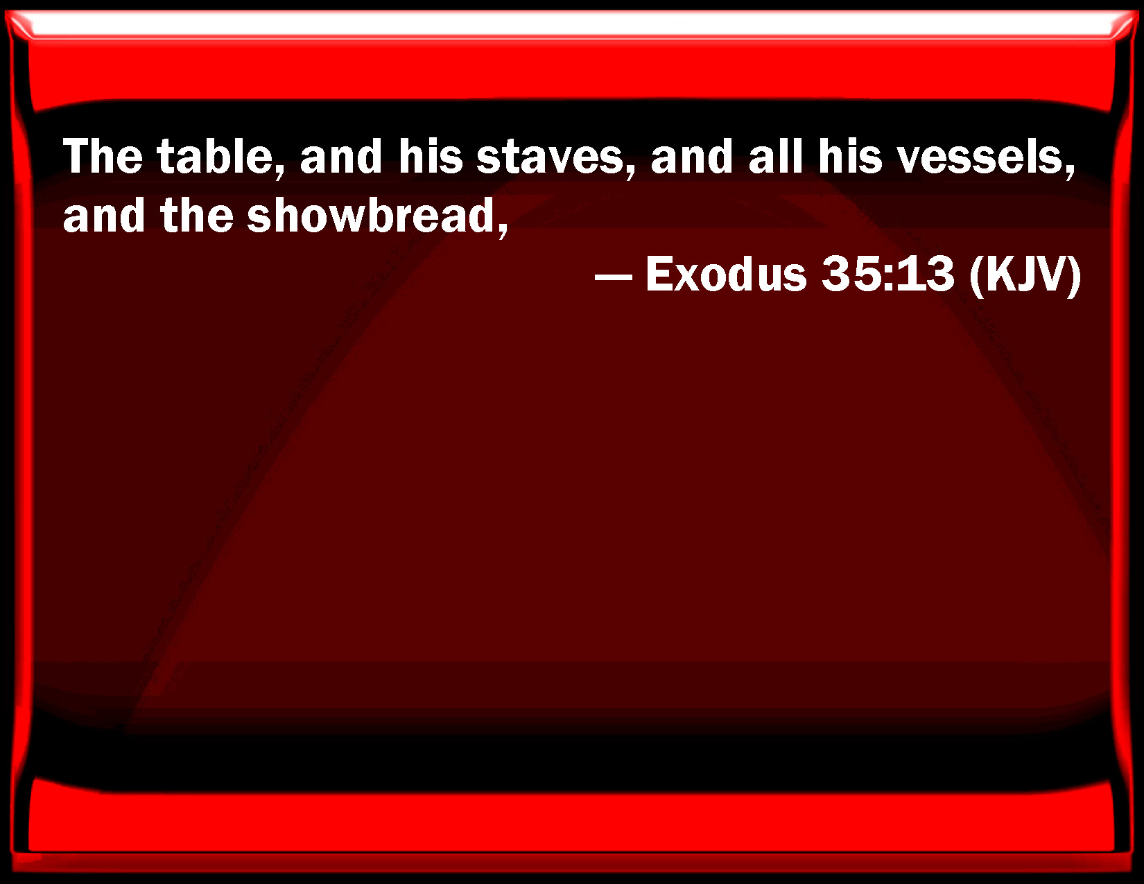 Bible Verse Slide Exodus 35:13 The table, and his staves, and all his vessels, and the show bread, KJV: The table, and his staves, and all his vessels, and the shewbread, DRB: The table with the bars and the vessels, and the loaves of proposition: DBT: the table and its staves, and all its utensils, and the shewbread; ERV: the table, and its staves, and all its vessels, and the shewbread; WBT: The table, and its staffs, and all its vessels, and the show-bread, WEB: the table with its poles and all its vessels, and the show bread; YLT: 'The table and its staves, and all its vessels, and the bread of the presence,Links Exodus 35:13 NIV • Exodus 35:13 NLT • Exodus 35:13 ESV • Exodus 35:13 NASB • Exodus 35:13 KJV • Exodus 35:13 Interlinear • Exodus 35:13 Commentaries • Exodus 35:13 Parallel Texts • Exodus 35:13 Bible Apps • Exodus 35:13 Parallel • Bible Hub |