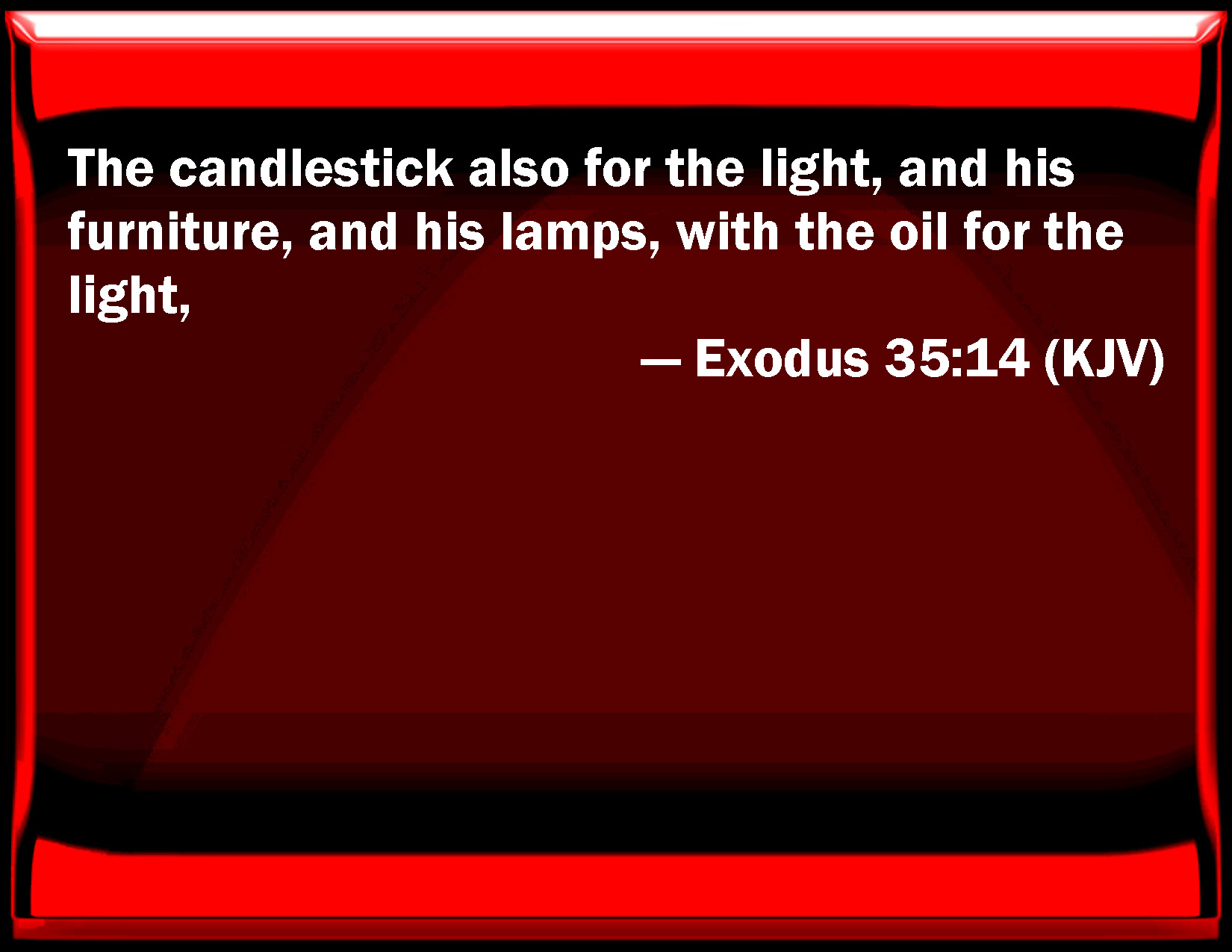 Bible Verse Slide Exodus 35:14 The candlestick also for the light, and his furniture, and his lamps, with the oil for the light, KJV: The candlestick also for the light, and his furniture, and his lamps, with the oil for the light, DRB: The candlestick to bear up the lights, the vessels thereof and the lamps, and the oil for the nourishing of fires: DBT: and the lamp-stand for the light, and its utensils, and its lamps, and the oil for the light; ERV: the candlestick also for the light, and its vessels, and its lamps, and the oil for the light; WBT: The candlestick also for the light, and its furniture, and its lamps, with the oil for the light, WEB: the lampstand also for the light, with its vessels, its lamps, and the oil for the light; YLT: 'And the candlestick for the light, and its vessels, and its lamps, and the oil for the light,Links Exodus 35:14 NIV • Exodus 35:14 NLT • Exodus 35:14 ESV • Exodus 35:14 NASB • Exodus 35:14 KJV • Exodus 35:14 Interlinear • Exodus 35:14 Commentaries • Exodus 35:14 Parallel Texts • Exodus 35:14 Bible Apps • Exodus 35:14 Parallel • Bible Hub |