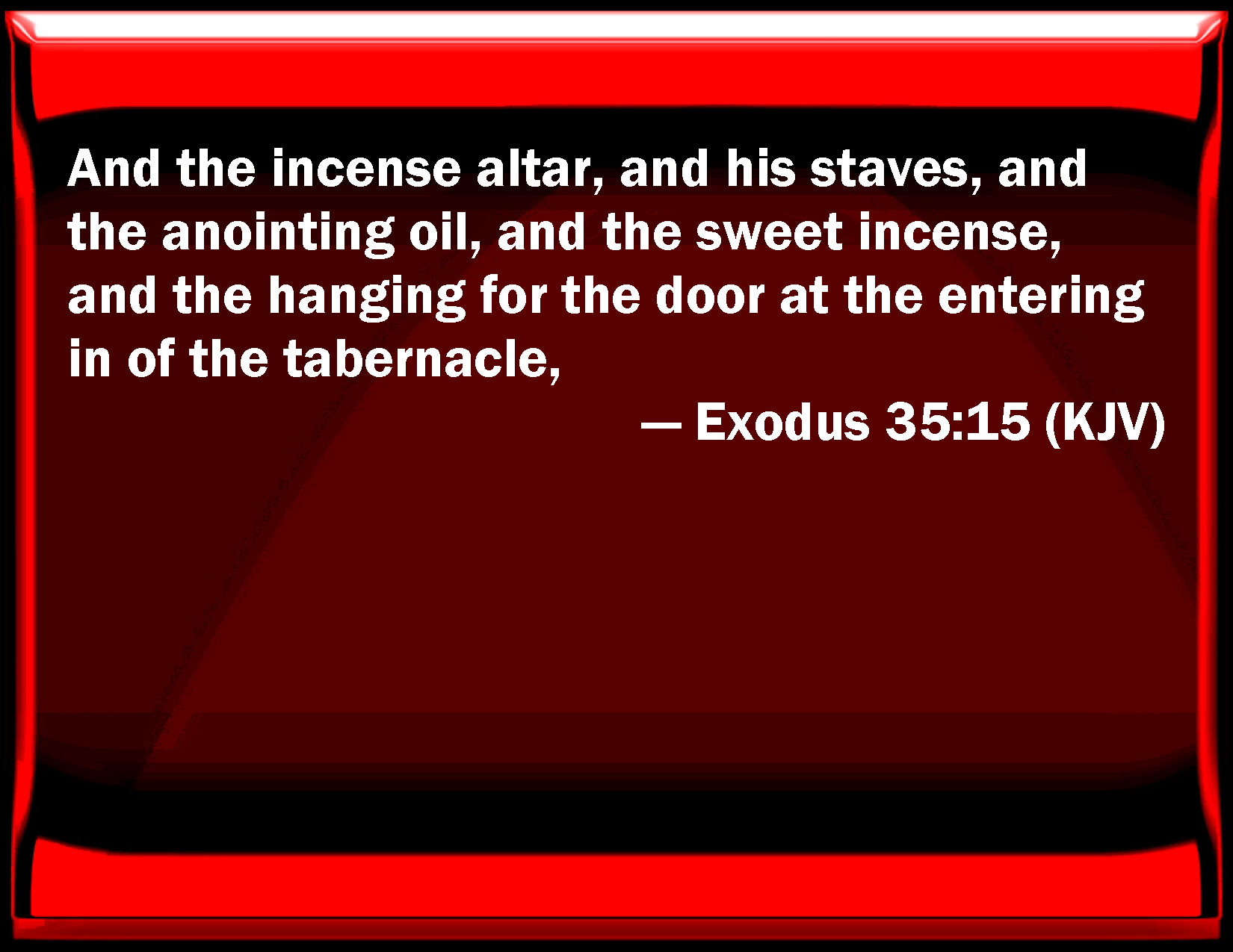 Bible Verse Slide Exodus 35:15 And the incense altar, and his staves, and the anointing oil, and the sweet incense, and the hanging for the door at the entering in of the tabernacle, KJV: And the incense altar, and his staves, and the anointing oil, and the sweet incense, and the hanging for the door at the entering in of the tabernacle, DRB: The altar of incense, and the bars, and the oil of unction and the incense of spices: the hanging at the door of the tabernacle: DBT: and the altar of incense, and its staves; and the anointing-oil, and the incense of fragrant drugs; and the entrance-curtain at the entrance of the tabernacle; ERV: and the altar of incense, and its staves, and the anointing oil, and the sweet incense, and the screen for the door, at the door of the tabernacle; WBT: And the incense-altar, and its staffs, and the anointing oil, and the sweet incense, and the hanging for the door at the entrance of the tabernacle, WEB: and the altar of incense with its poles, the anointing oil, the sweet incense, the screen for the door, at the door of the tabernacle; YLT: 'And the altar of perfume, and its staves, and the anointing oil, and the spice perfume, and the covering of the opening at the opening of the tabernacle,Links Exodus 35:15 NIV • Exodus 35:15 NLT • Exodus 35:15 ESV • Exodus 35:15 NASB • Exodus 35:15 KJV • Exodus 35:15 Interlinear • Exodus 35:15 Commentaries • Exodus 35:15 Parallel Texts • Exodus 35:15 Bible Apps • Exodus 35:15 Parallel • Bible Hub |