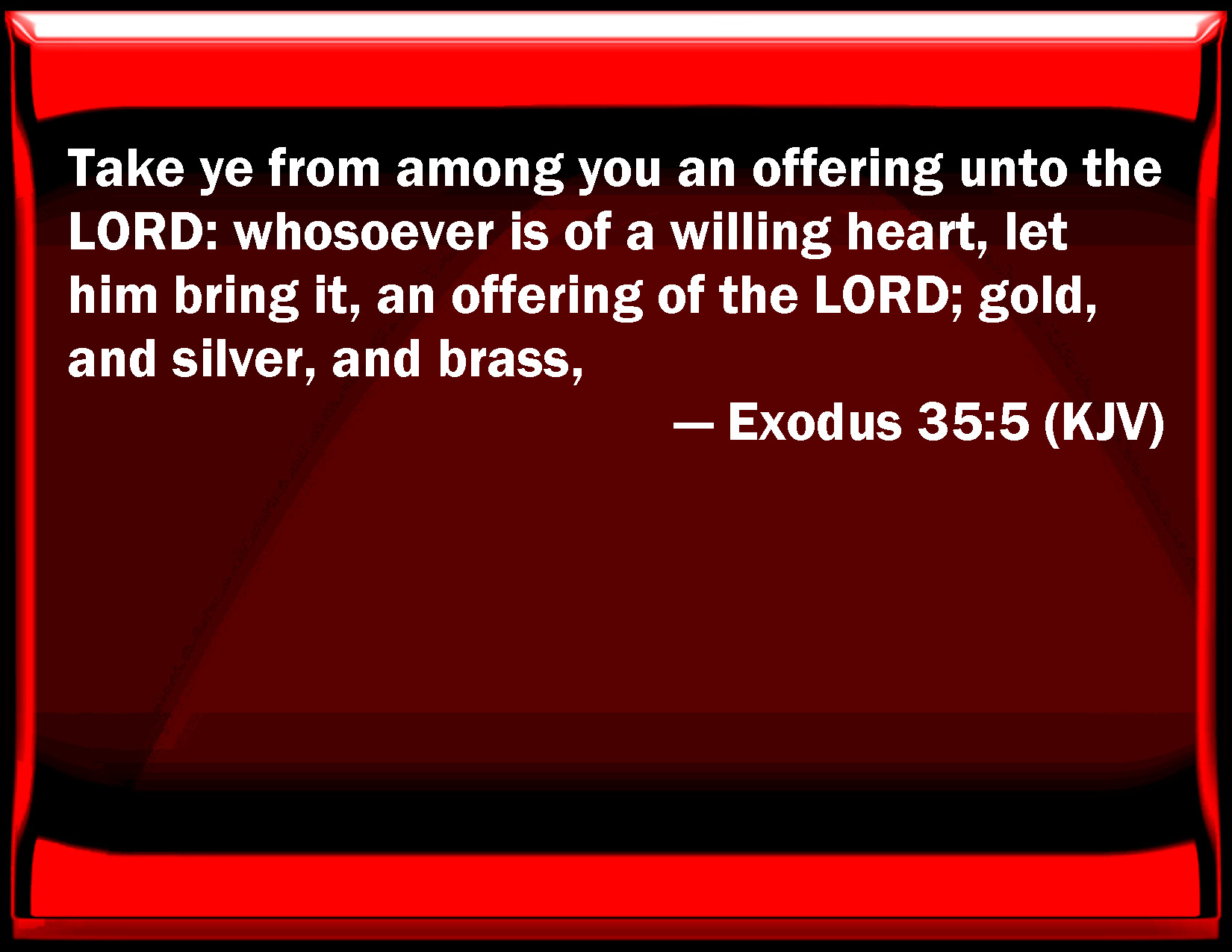 Exodus 35:5 Take you from among you an offering to the LORD: whoever is of a willing heart, let him bring it, an offering of the LORD; gold, and silver, and brass,